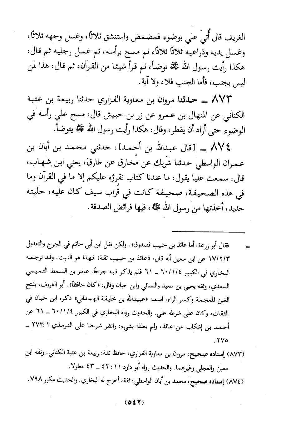 873 - حدثنا مروان بن معاوية الفزاري حدثنا ربيعة بن عتبة الكناني عن المنهال بن عمرو عن زر بن حبيش قال: مسح علي رأسه في الوضوء حتى أراد أن يقطر، وقال: هكذا رأيت رسول الله - صلى الله عليه وسلم - يتوضأ.