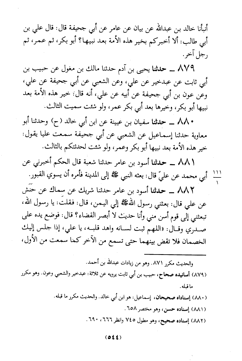 (879) أسانيده صحاح، حبيب بن أبي ثابت يرويه عن ثلاثة: عبد خير والشعبي وعون. وهو مكرر