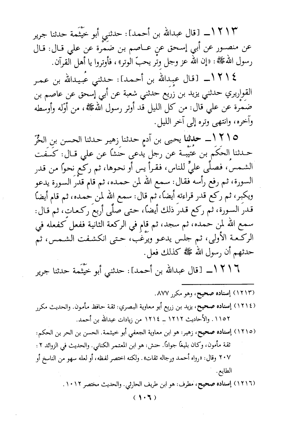 1213 - [قال عبد الله بن أحمد]: حدثني أبو خَيْثَمة حدثنا جرير عن منصور عن أبي إسحق عن عاصم بن ضَمْرة عن على قال: قال رسول الله - صلى الله عليه وسلم -: "إن الله عز وجل وِتْر يحبّ الوتر"، فأوتروا يا أهل القرآن.
