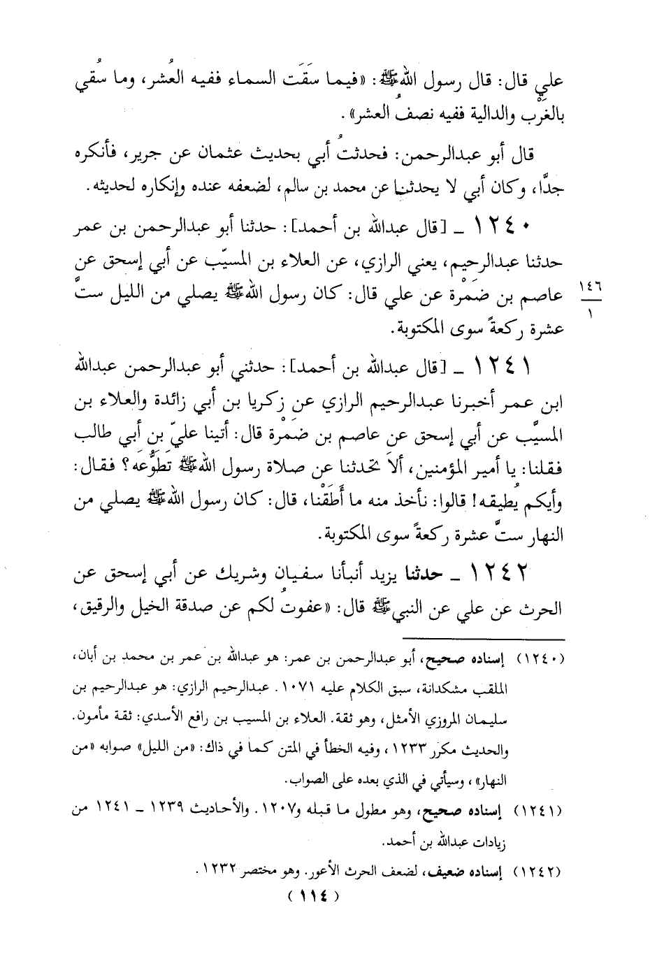 1241 - [قال عبد الله بن أحمد]: حدثني أبو عبد الرحمن عبد الله ابن عمر أخبرنا عبد الرحيم الرازي عنِ زكريا بن أبي زائدة والعلاء بن المسيَّب عن أبي إسحق عن عاصم بن ضمْرة قال: أتينا عليِّ بن أبي طالب فقلنا: يا أمير المؤمنين، ألاَ تحدثنا عن صلاة رسول الله - صلى الله عليه وسلم - تطوّعَه؟ فقال: وأيكم يُطيقه! قالوا: نأخذ منه ما أَطَقْنا، قال: كان رسول الله - صلى الله عليه وسلم - يصلي من النهار ستَّ عشرة ركعةً سوى المكتوبة.