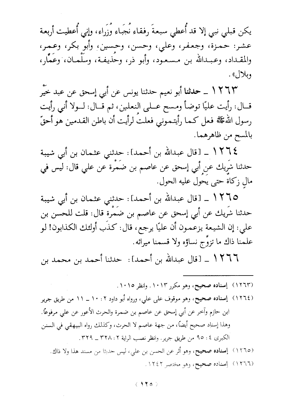 1265 - [قال عبد الله بن أحمد]: حدثني عثمان بن أبي شيبة حدثنا شريك عن أبي إسحق عن عاصم بن ضَمرة قال: قلت للحسن بن على: إن الشيعة يزعمون أن عليّا يرجع، قال: كذَب أولئك الكذابون! لو علمنا ذاك ما تزوَّج نساؤه ولا قسمنا ميراثه.