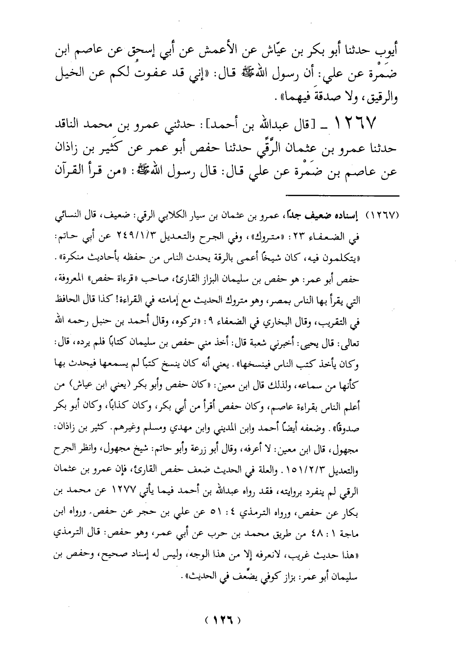 1267 - [قال عبد الله بن أحمد]: حدثني عمرو بن محمد الناقد حدثنا عمرو بن عثمان الرَّقِّي حدثنا حفص أبو عمر عن كَثير بن زاذان عن عاصم بن ضَمْرة عن علي قال: قال رسول الله - صلى الله عليه وسلم -: "من قرأ القرآن