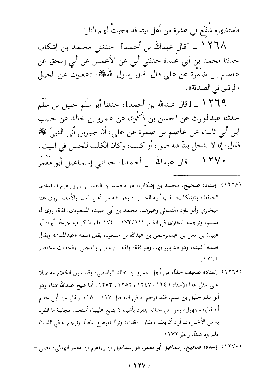 (1268) إسناده صحيح، محمد بن إشكاب: هو محمد بن الحسين بن إبراهيم البغدادي الحافظ، و"إشكاب" لقب أبيه الحسين، وهو ثقة من أهل العلم والأمانة، روى عنه البخاري وأبو داود والنسائي وغيرهم. محمد بن أبي عبيدة المسعودي: ثقة، روى له مسلم، وترجمه البخاري في الكبير 1/ 1/173 - 174 فلم يذكر فيه جرحا ً. أبوه: أبو عبيدة بن معن بن عبد الرحمن بن عبد الله بن مسعود، يقال اسمه "عبد الملك" ويقال اسمه كنيته، وهو مشهور بها، وهو ثقة، وثقه ابن معين والعجلي. والحديث مختصر 1266.