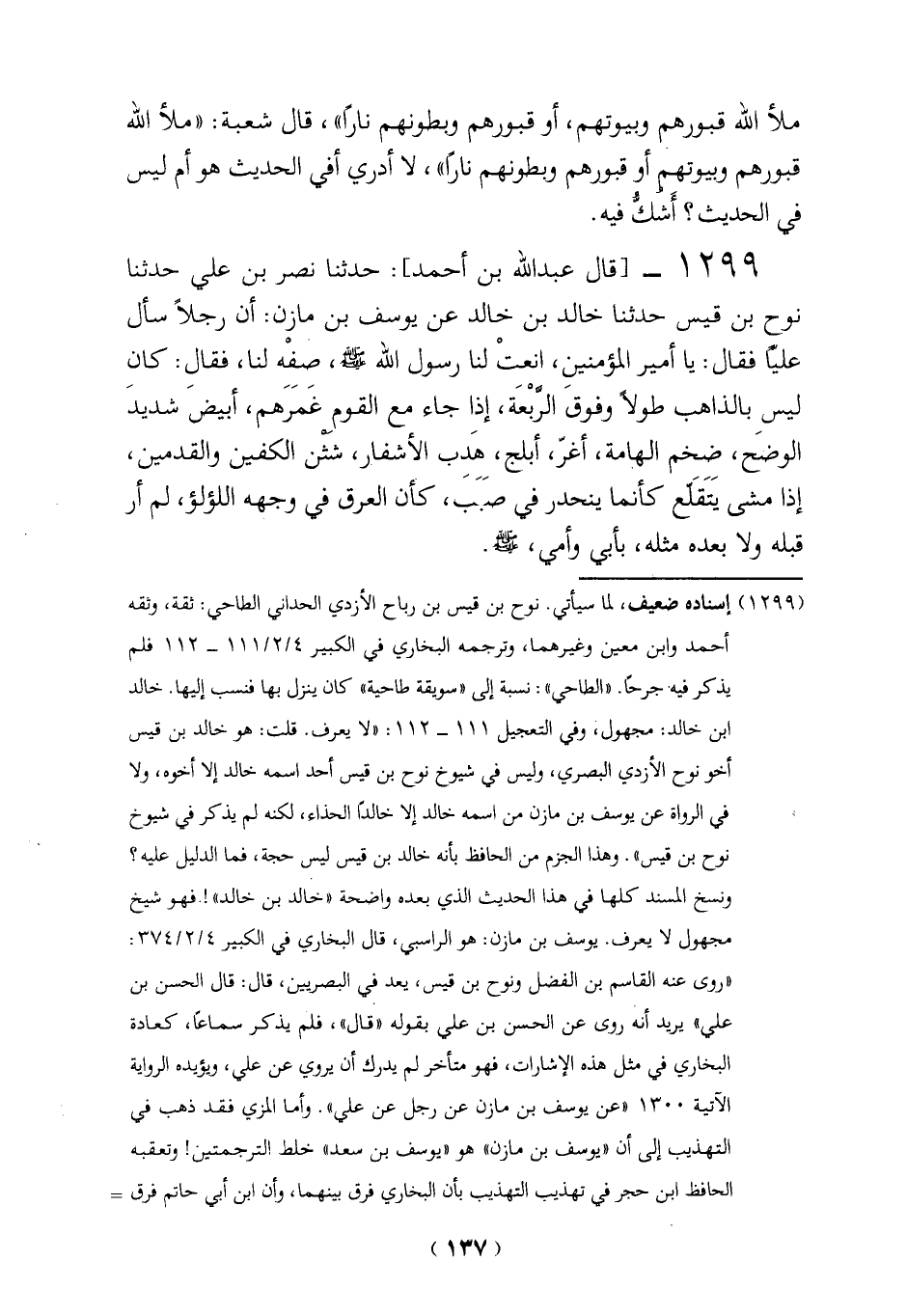 1299 - [قال عبد الله بن أحمد]: حدثنا نصر بن علي حدثنا نوح بن قيس حدثنا خالد بن خالد عن يوسف بن مازن: أن رجلاً سأل عليَّا فقال: يا أمير المؤمنين، انعتْ لنا رسول الله - صلى الله عليه وسلم -، صفه لنا، فقال: كان ليس بالذاهب طولاً وفوقَ الرَّبْعَة، إذا جاء مع القوم غَمَرَهم، أبيضَ شديدَ الوضَح، ضخم الهامة، أغرّ، أبلج، هَدِب الأشفار، شَثْن الكفين والقدمين، إذا مشى يَتَقَلَّع كأنما ينحدر في صَبَب، كأن العرق في وجهه اللؤلؤ، لم أر قبله ولا بعده مثله، بأبي وأمى، - صلى الله عليه وسلم -.