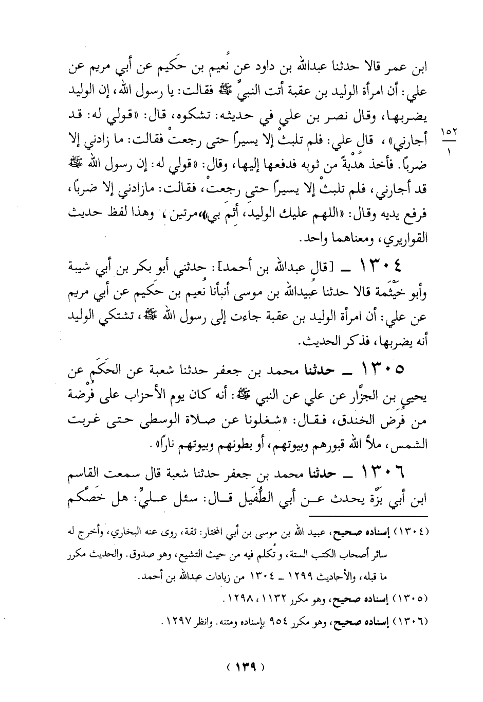 1304 - [قال عبد الله بن أحمد]: حدتني أبو بكر بن أبي شيبة وأبو خَيْثَمة قالا حدثنا عُبيد الله بن موسى أنبأنا نُعيم بن حَكيم عن أبي مريم عن علي: أن امرأة الوليد بن عقبة جاءت إلى رسول الله - صلى الله عليه وسلم -، تشتكي الوليد أنه يضربها، فذكر الحديث.
