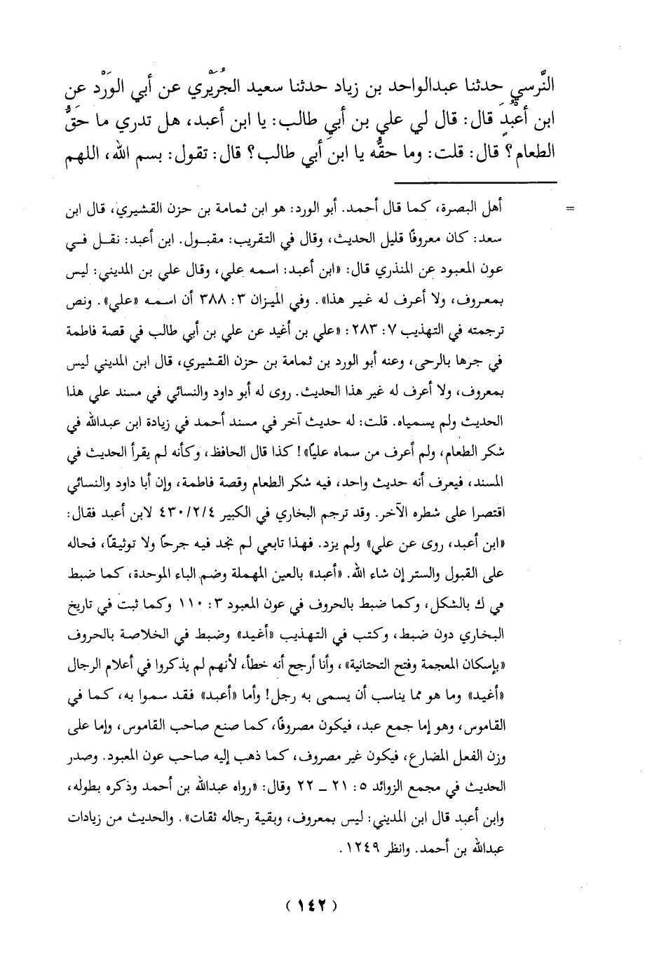 النَّرسي حدثنا عبد الواحد بن زياد حدثنا سعيد الجُرَيْري عن أبي الوَرْد عِن ابن أعْبُدَ قال: قال لى علي بن أبي طالب: يا ابن أعبد، هل تدري ما حقُّ الطعام؟ قال: قلت: وما حقُّه يا ابن أبي طالب؟ قال: تقول: بسم الله، اللهم