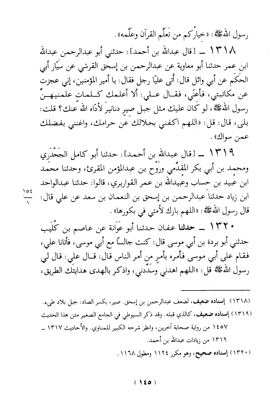 1318 - [قال عبد الله بن أحمد]: حدثني أبو عبد الرحمن عبد الله ابن عمر حدثنا أبو معاوية عن عبد الرحمن بن إسحق القرشي عن سَيّار أبي الحَكَم عن أبي وائل قال: أَتى عليّا رجل فقال: يا أمير المؤمنين، إني عجزت عن مكاتبتي، فأعنّي، فقال علي: ألا أعلمكِ كلماتٍ علمنيهنَّ رسول الله - صلى الله عليه وسلم -، لو كَان عليك مثل جبل صيرٍ دنانير لأدّاه الله عنك؟ قلت: بلى، قال: قلْ: "اللهم اكفني بحلالكَ عن حرامك، واغنني بفضلك عمن سواك".