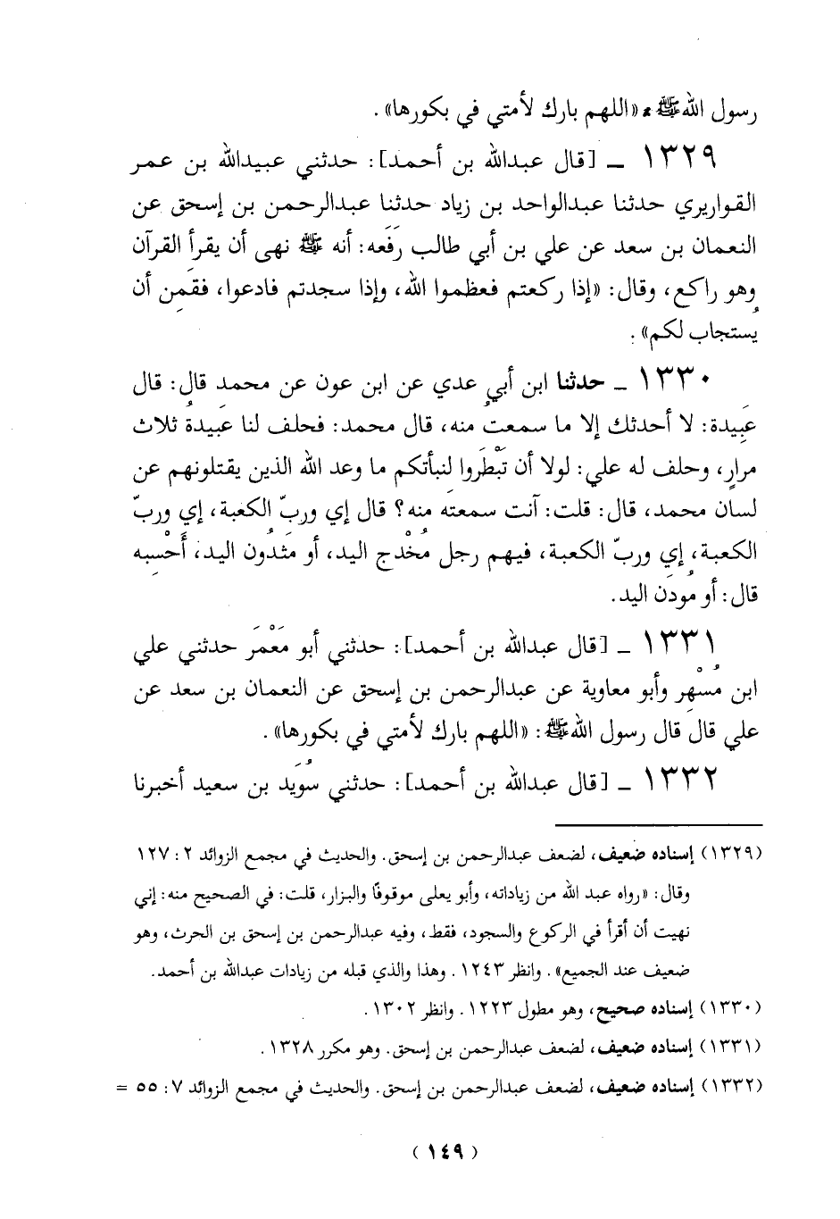 1331 - [قال عبد الله بن أحمد]: حدثني أبو مَعْمَر حدثني علي ابن مُسْهِر وأبو معاوية عن عبد الرحمن بن إسحق عن النعمان بن سعد عن علي قال قال رسول الله - صلى الله عليه وسلم -: "اللهم بارك لأمتي في بكورها".