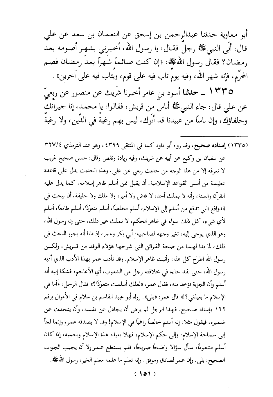 (1335) إسناده صحيح، وقد رواه أبو داود كما في المنتقى 4399، وهو عند الترمذي 4/ 327 عن سفيان بن وكيع عن أبيه عن شريك، وفيه زيادة ونقص وقال: حسن صحيح غريب لا نعرفه إلا من هذا الوجه من حديث ربعي عن علي، وهذا الحديث يدل على قاعدة عظية من أسس القواعد الإسلامية: أن يقبل ممن أسلم طاهر إسلامه، كما يدل عليه القرآن والسنة، وأنه لا يملك أحد، لا قاض ولا أمير، ولا ملك ولا خليفة، أن يبحث في الدوافع التي تدفع من أسلم إلى الإسلام، أسلم مخلصاً، أسلم متعوَّذَاً، أسلم طامعَاً، أسلم لأي شيء، كل ذلك سواء في ظاهر الحكم، لا نملك غير ذلك، حتى إن رسول الله، وهو الذي يوحي إليه، تغير وجهه لصاحبيه: أبي بكر وعمر، إذ ظنا أنه يجوز البحث في ذلك، لما بدا لهما من صحة القرائن التى شرحها هؤلاء الوفد من قريش، ولكن رسول الله اطرح كل هذا، وأثبت ظاهر الإسلام. وقد تأدب عمر بهذا الأدب الذي أدبه رسول الله، حتى لقد جاءه في خلافته رجل من الشعوب، أي الأعاجم، فشكا إليه أنه أسلم وأن الجزية تؤخذ منه، فقال عمر: "لعلك أسلمت متعوَّذَاً؟ " فقال الرجل: "أما في الإسلام ما يعيذني؟! " قال عمر: "بلى". رواه أبو عبيد القاسم بن سلام في الأموال برقم 122 بإسناد صحيح. فهذا الرجل لم يرض أن يجادل عن نفسه، وأن يتحدث عن ضميره،. فيقول مثلا: إنه أسلم خالصَاً راغباً في الإسلام! وقد لا يصدقه عمر، وإنما لجأ إلى سماحة الإسلام، وإلى حكم الإسلام، فهلا يعيذه هذا الإسلام ويحميه، إذا كان أسلم متعوذَاً، سأل سؤالا واضحَاً صريحَاً، فلم يستطع عمر إلا أن يجيب الجواب الصحيح: بلى. وإن عمر لصادق وموفق، وإنه تعلم ما علمه معلم الخير، رسول الله - صلى الله عليه وسلم -.
