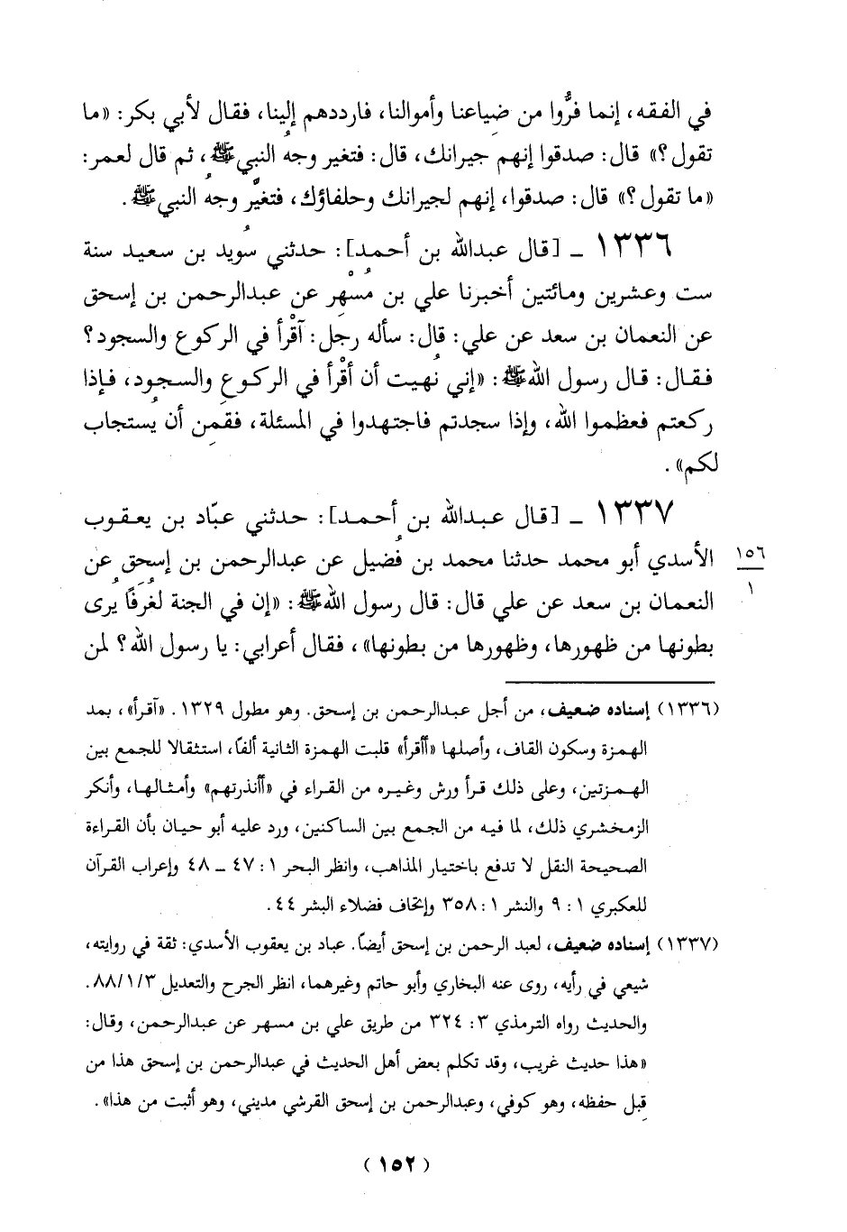 1336 - [قال عبد الله بن أحمد]: حدثني سويد بن سعيد سنة ست وعشرين ومائتين أخبرنا على بن مُسْهِر عن عبد الرحمن بن إسحق عن النعمان بن سعد عن علي: قال: سأله رجل:؟ أقْرأ في الركوع والسجود؟ فقال: قال رسول الله - صلى الله عليه وسلم -: "إني نُهيت أن أقْرأ في الركوعِ والسجود، فإذا ركعتم فعظموا الله، وإذا سجدتم فاجتهدوا في المسئلة، فقمن أن يُستجاب لكم".