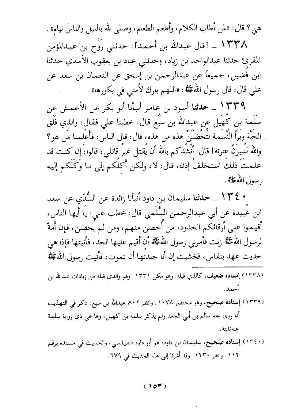 1340 - حدثنا سليمان بن داود أنبأنا زائدة عن السُّدّي عن سعد ابن عُبيدة عن أبي عبد الرحمن السُّلَمي قال: خطب علي: يَا أيها الناس، أقيموا على أرقائكم الحدود، من أُحصن منهم، ومن لم يحصن، فإن أمة لرسول الله - صلى الله عليه وسلم - زنت فأمرني رسول الله - صلى الله عليه وسلم - أن أقيم عليها الحد، فأتيتها. فإذا هي حديث عهد بنفاس، فخشيت إن أنا جلدتُها أن تموت، فأتيت رسول الله - صلى الله عليه وسلم -