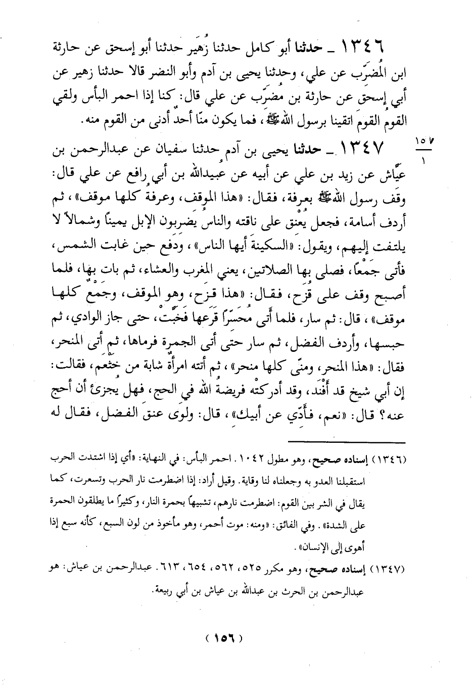 1347.- حدثنا يحيى بن آدم حدثنا سفيان عن عبد الرحمن بن عَيَّاش عن زيد بن علي عن أبيه عن عُبيد الله بن أبي رافع عن علي قال: وقَف رسول الله - صلى الله عليه وسلم - بعرفة، فقال: "هذا الموقفِ، وعرفة كلها موقف"، ثم أردف أسامة، فجعل يُعْنق على ناقته والناسُ يضرِبِون الإبل يميناً وشمالاً لا يلتفت إليهم، ويقول: َ "السكينةَ أيها الناس"، ودفع جين غابت الشمس، فأتى جَمْعاً، فصلى بهِا الصلاتين، يعنى المغرب والعشاء، ثم باتِ بها، فلما أصبح وقف على قُزَح، فقال: "هِذا قِزَح، وهو الموقف، وجَمْعٌ كلها موقف"، قال: ثم سار، فلما أَتى مُحسَّراً قَرعها فَخَبَّتْ، حتى جاز الوادي، ثم حبسها، وأردت الفضل، ثم سار حتَى أتى الجمرة فرماها، ثم أِتى المنحر، فقال: "هذا المنحر، ومنَّى كلها منحر"، ثم أتته امرأةٌ شابة من خَثْعَم، فقالت: إن أبي شيخ قد أَفْنَد، وقد أدركتْه فريضةُ الله فىِ الحج، فهل يُجزئ أن أحج عنه؟ قال: "نعم، فأَدَّي عن أبيك"، قال: ولوَى عنقَ الفضل، فقال له
