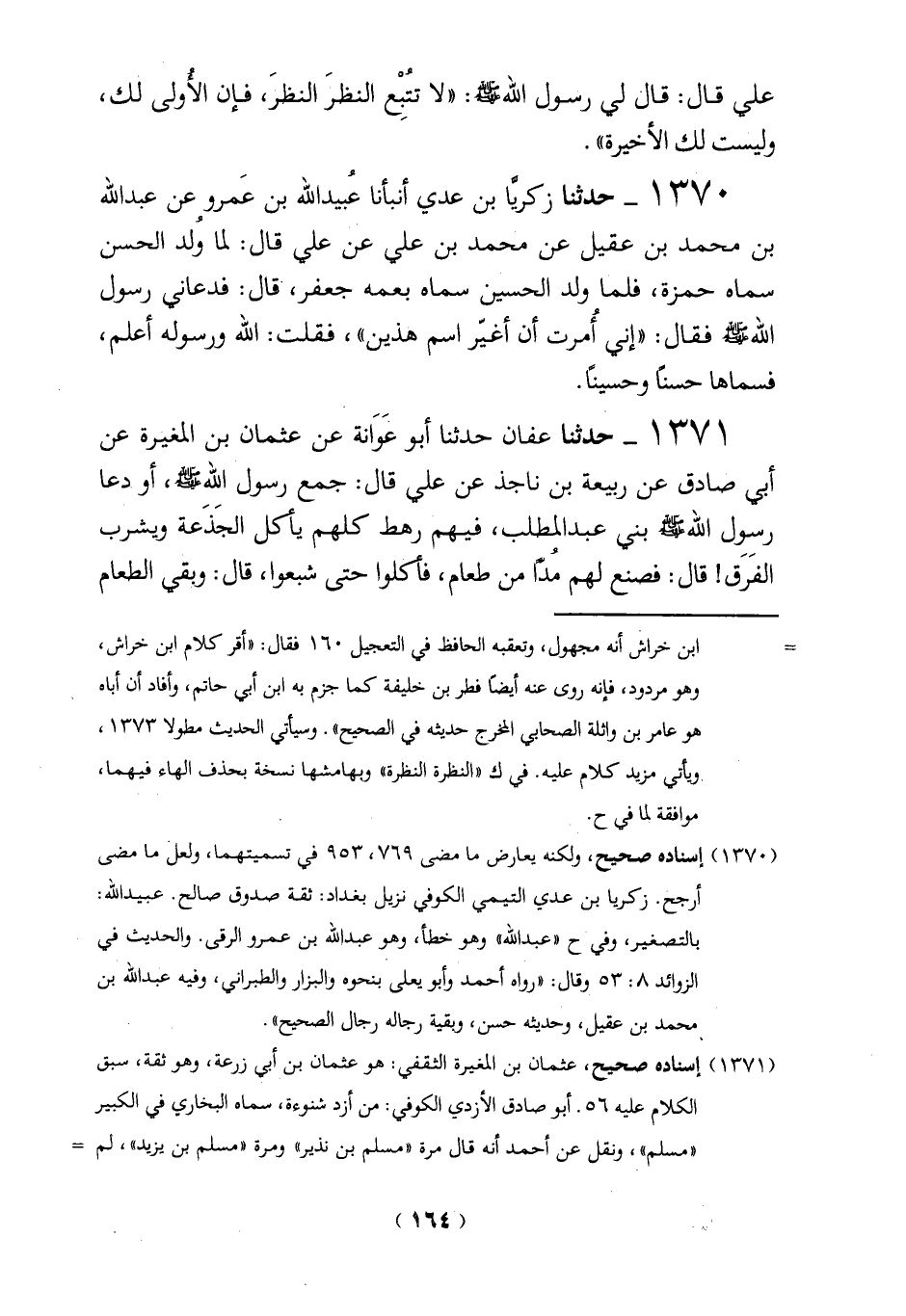 1370 - حدثنا زكريَّا بن عدي أنبأنا عُبيد الله بن عَمرو عن عبد الله بن محمد بن عقيل عن محمد بن علي عن علي قال: لما وُلد الحسن سماه حمزة، فلما ولد الحسين سماه بعمه جعفر، قال: فدعاني رسول الله - صلى الله عليه وسلم - فقال: "إني أُمرت أن أغيّر اسم هذين"، فقلت: الله ورسوله أعلم، فسماها حسناً وحسيناً.