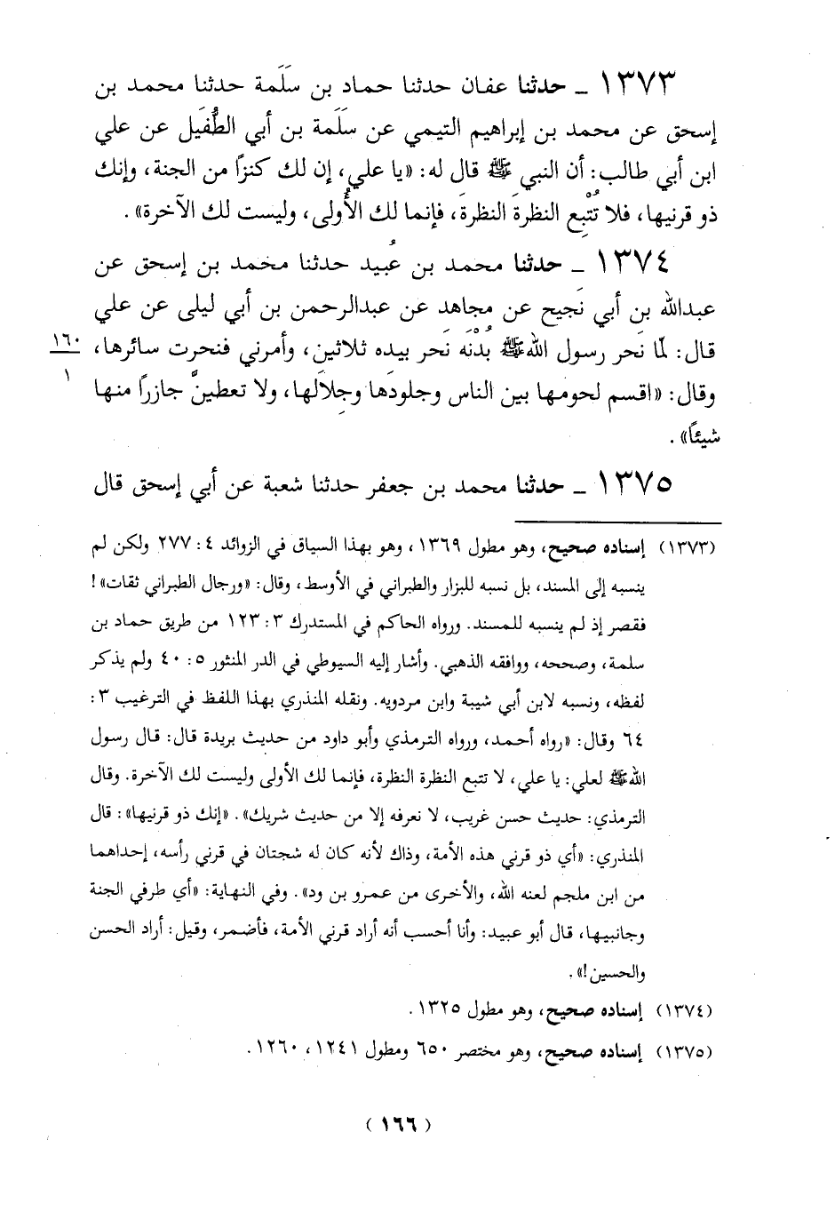 1373 - حدثنا عفان حدثنا حماد بن سَلَمة حدثنا محمد بن إسحق عن محمد بن إبراهيم التيمي عن سَلَمة بن أبي الطُّفَيل عن علي ابن أبي طالب: أن النبي - صلى الله عليه وسلم - قال له: "يا علي، إن لك كنزاً من الجنة، وإنك ذو قرنيها، فلا تُتْبِع النظرةَ النظرةَ، فإنما لك الأولى، وليست لك الآخرة".