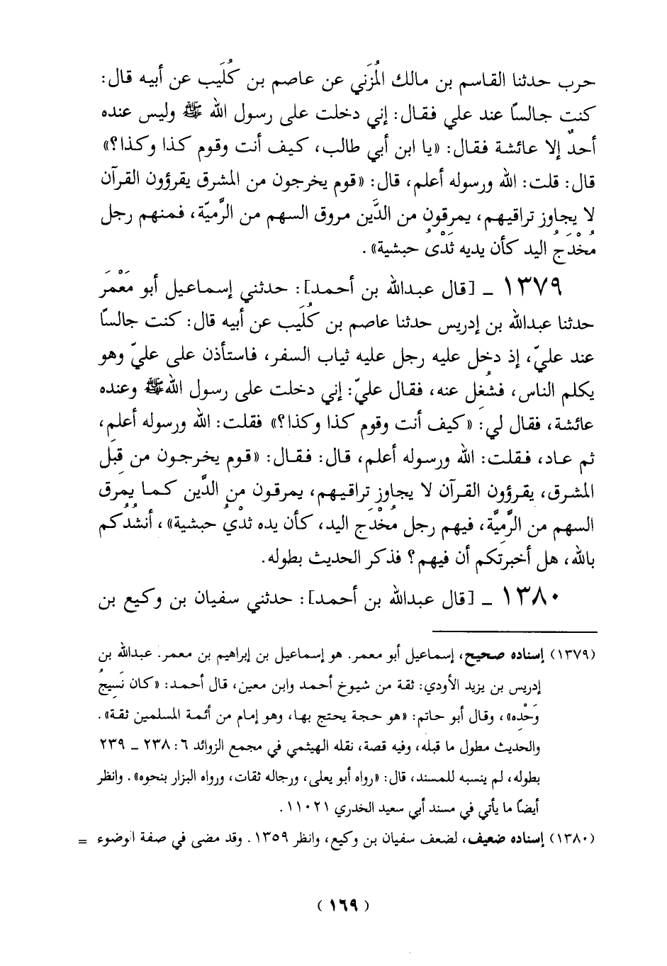 1379 - [قال عبد الله بن أحمد]: حدثني إسماعيل أبو مَعْمَر حدثنا عبد الله بن إدريس حدثنا عاصم بن كُلَيب عن أبيه قال: كنت جالساً عند عليّ، إذ دخل عليه رجل عليه ثياب السفر، فاستأذن على عليّ وهو يكلم الناس، فشُغل عنه، فقال عليّ: إني دخلت على رسول الله - صلى الله عليه وسلم - وعنده عائشة، فقال لى: "كيف أنت وقوم كذا وكذا؟ " فقلت: الله ورسوله أعلمِ، ثم عاد، فقلت: الله ورسوله أعلم، قال: فقال: "قوم يخرجون من قِبَل المشرق، يقرؤون القرآن لا يجاوز تراقيهم، يمرقون من الدَّين كما يمرق السهم من الرَّميَّة، فيهم رجل مُخْدَج اليد، كأن يده ثدْيُ حبشية"، أنشُدُكم بالله، هل أخبرَتكم أن فيهم؟ فذكر الحديث بطوله.