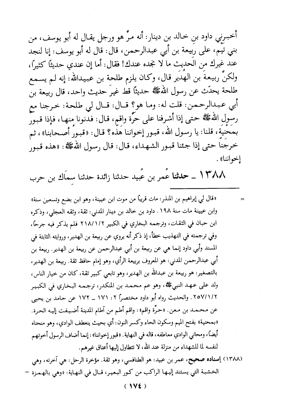 أخبرِنى داود بنِ خالد بن دينار: أنه مرَّ هو ورجل يقال له أبو يوسف، من بني تيْم، على ربيعة بن أبي عبد الرحمن، قال: قال له أبو يوسف- إنا لنجد عند غيرك مِن الَحديث ما لا بخده عندك! فقال: أما إن عندي حديثًا كثيرًا، ولكنَّ ربيعة بن الهُدَير قال، وكان يلزم طلحة بن عبيد الله: إنه لم يسمع طلحة يحدّث عن رسول الله - صلى الله عليه وسلم - حديثًا قط غيرَ حديث واحد، قال ربيعة بن أبي عبد الرحمن: قلت له: وما هو؟ قال: قال لى طلحة: خرجنا مع رسِولِ الله - صلى الله عليه وسلم - حتى إذا أشرفنا على حَرَّة واقمٍ، قال: فدنونا منها، فإذا قبور بمَحْنيَة، قلنا: يا رسول الله، قبور إخواننا هَذه؟ قال: "قبور أصحابنا"، ثم خرجَنا حتى إذا جئنا قبور الشهداء، قال: قال رسول الله - صلى الله عليه وسلم -: "هذه قبور إخواننا".