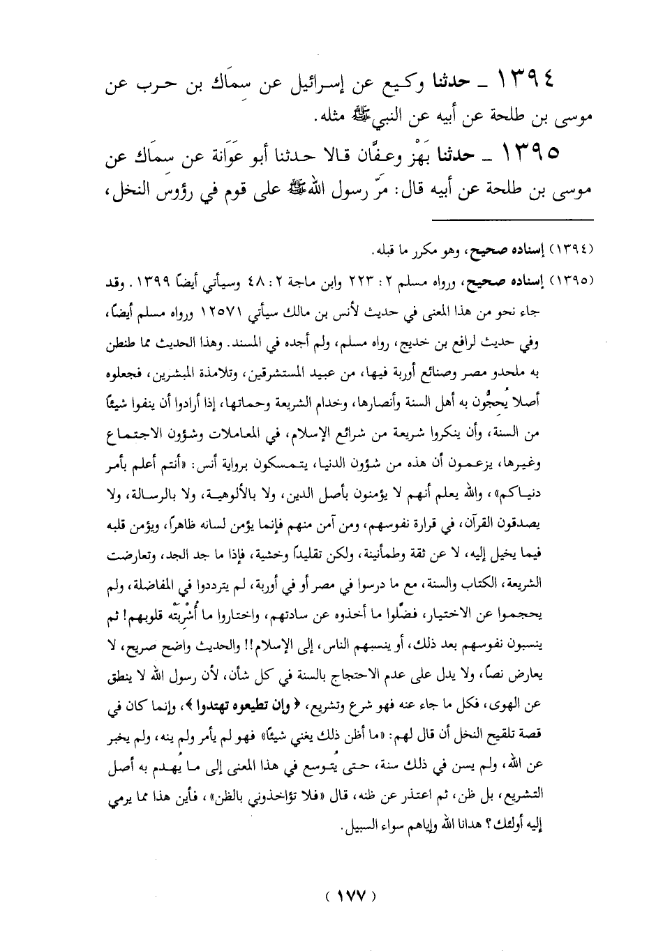 (1395) إسناده صحيح، ورواه مسلم 2: 223 وابن ماجة 2: 48 وسيأتي أيضاً 1399. وقد جاء نحو من هذا المعني في حديث لأنس بن مالك سيأتي 12571 ورواه مسلم أيضاً، وفى حديث لرافع بن خديج، رواه مسلم، ولم أجده في المسند. وهذا الحديث مما طنطن به ملحدو مصر وصنائع أوربة فيها، من عبيد المستشرقين، وتلامذة المبشرين، فجعلوه أصلا يحِجُّون به أهل السنة وأنصارها، وخدام الشريعة وحماتها، إذا أرادوا أن ينفوا شيئاً من السنة، وأن ينكروا شريعة من شرائع الإسلام، في المعاملات وشؤون الاجتماع وغيرها، يزعمون أن هذه من شؤون الدنيا، يتمسكون برواية أنس: "أنتم أعلم بأمر دنياكم"، والله يعلم أنهم لا يؤمنون بأصل الدين، ولا بالألوهية، ولا بالرسالة، ولا يصدقون القرآن، في قرارة نفوسهم، ومن آمن منهم فإنما يؤمن لسانه ظاهراً، ويؤمن قلبه فيما يخيل إليه، لا عن ثقة وطمأنينة، ولكن تقليدَاً وخشية، فإذا ما جد الجد، وتعارضت الشريعة، الكتاب والسنة، مع ما درسوا في مصر أو في أوربة، لم يترددوا في المفاضلة، ولم يحجموا عن الاختيار، فضَّلوا ما أخذوه عن سادتهم، واختاروا ما أُشْرِبَتْه قلوبهم! ثم ينسبون نفوسهم بعد ذلك، أو ينسبهم الناس، إلى الإسلام!! والحديث واضح صريح، لا يعارض نصَاً، ولا يدل على عدم الاحتجاج بالسنة في كل شأن، لأن رسول الله لا ينطق عن الهوى، فكل ما جاء عنه فهو شرع وتشريع {وَإِنْ تُطِيعُوهُ تَهْتَدُوا}، وإنما كان في قصة تلقيح النخل أن قال لهم: "ما أظن ذلك يغني شيئاً" فهو لم يأمر ولم ينه، ولم يخبر عن الله، ولم يسن في ذلك سنة، حتى يُتوسع في هذا المعنى إلى ما يُهدم به أصل التشريع، بل ظن، ثم اعتذر عن ظنه، قال "فلا تؤاخذوني بالظن"، فأين هذا مما يرمي إليه أولئك؟ هدانا الله وإياهم سواء السبيل.