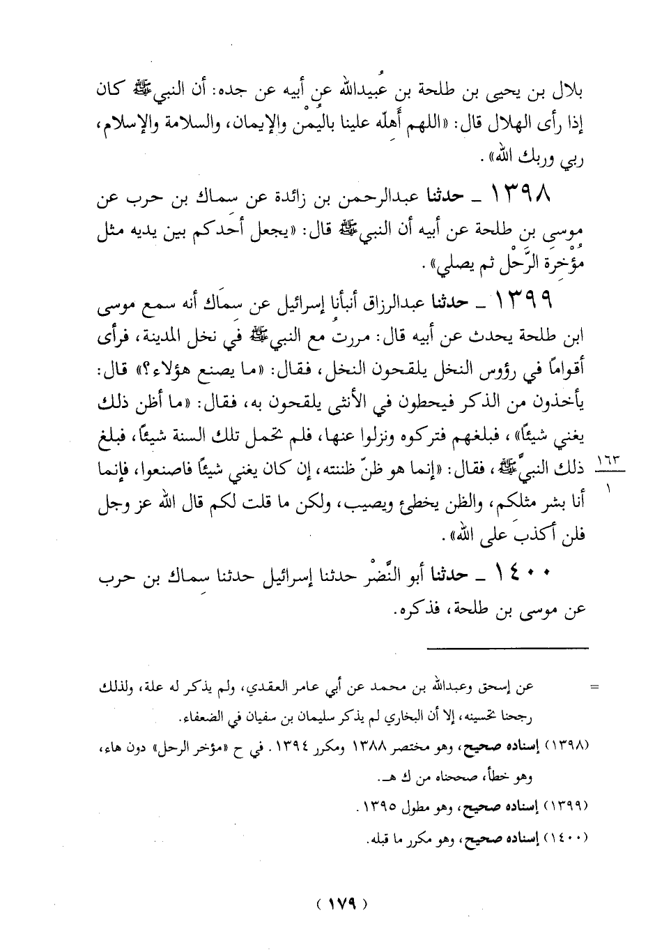 1399 - حدثنا عبد الرزاق أنبأنا إسرائيل عن سِمَاك أنه سمع موسى ابن طلحة يحدث عن أبيه قال: مررتُ مع النبي - صلى الله عليه وسلم - في نخل المدينة، فرأى أقواماً في رؤوس النخل يلقحون النخل، فقال: "ما يصنع هؤلاء؟ " قال: يأخذون من الذكر فيحطون في الأنثى يلقحون به، فقال: "ما أظن ذلك يغني شيئاً"، فبلغهم فتركوه ونزلوا عنها، فلم تحمل تلك السنة شيئاً، فبلغ ذلك النبي - صلى الله عليه وسلم -، فقال: "إنما هو ظنّ ظننته، إن كان يغني شيئاً فاصنعوا، فإنما أنا بشر مثلكِم، والظن يخطئ ويصيب، ولكن ما قلت لكم قال الله عزوجل فلن أكذب على الله".
