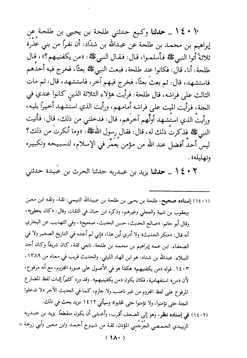 1401 - حدثنا وكيعْ حدثني طلحة بن يحيى بن طلحة عنِ إبراهيم بن محمد بن طلحة عن عبد الله بن شدّاد: أن نفرًا من بني عُذْرَة ثلاثةً أتوا النبي - صلى الله عليه وسلم - فأسلموا، قال: فقال النبي - صلى الله عليه وسلم -: "من يكفنيهم؟ "، قال طلحة: أنا، قال: فكانوا عِند طلحة، فبعث النبي - صلى الله عليه وسلم - بعثًا، فخرج فيه أحدُهم فاستشهد، قال: ثم بعثَ بعثًا، فخرج فيهم آخر، فاستشهد، قال: ثم مات الثالث على فراشه، قال طلحة: فرأيت هؤلاء الثلاثة الذين كانوا عندي في الجنة، فرأيت الميت على فراشه أمامهم، ورأيت الذي استشهد أخيرًا يليه، ورأيت الذي اسشهد أولَّهم آخرَهم، قال: فدخلني من ذلك، قِال: فأتيت النبي - صلى الله عليه وسلم - فذكرتُ ذلك له، قال: فقال رسول الله - صلى الله عليه وسلم -: "وما أنكرت من ذلك؟ ليس أحدٌ أفضل عند الله من مؤمن يُعَمَّر في الإسلام، لتسبيحه وتكبيره وتهليله".