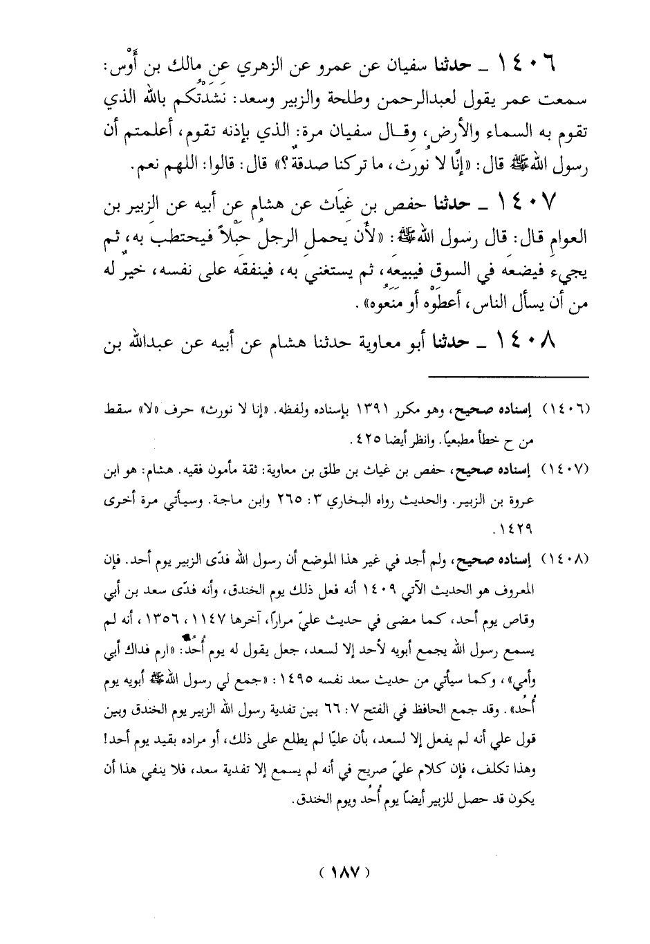 (1406) إسناده صحيح، وهو مكرر 1391 بإسناده ولفظه. "إنا لا نورث" حرف "لا" سقط من ح خطأ مطبعياً. وانظرأيضا 425.