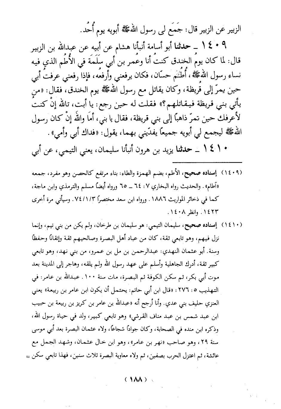1409 - حدثنا أبو أسامة أنبأنا هشام عن أبيه عن عبد الله بن الزبير قال: لما كان يومُ الخندق كنتُ أنا وعُمر بن أبي سَلَمَة في الأُطُم الذي فيه نساء رسول الله - صلى الله عليه وسلم -، أُطُم حسّان، فكان يرفعنى وأرفعُه، فإذا رفعنى عرفتُ أبي حين يمرّ إلى قُريظة، وكان يقاتل مع رسول الله - صلى الله عليه وسلم - يوم الخندق، فقال: "من يأتي بني قريظة فيقاتلهم؟ " فقلت له حين رجع: يا أبت، تالله إنْ كنتُ لأعرفك حين تمرّ ذاهباً إلى بني قريظة، فقال يا بني، أمَا والله إنْ كان رسول الله - صلى الله عليه وسلم - ليجمع لى أبويه جميعاً يفدّيني بهما، يقول: "فداك أبي وأمي".