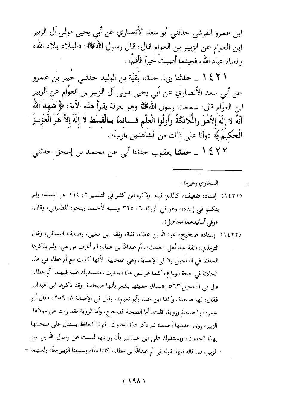 1421 - حدثنا يزيد حدثنا بَقِيّة بن الوليد حدثني جُبير بن عمرو عن أبي سعد الأنصاري عن أبي يحيى مولى آل الزبير بن العوَّام عن الزبير ابن العوّام قال: سمِعت رسول الله - صلى الله عليه وسلم - وهو بعرفة يقرأ هذه الآية: {شَهِدَ اللَّهُ أَنَّهُ لَا إِلَهَ إِلَّا هُوَ وَالْمَلَائِكَةُ وَأُولُو الْعِلْمِ قَائِمًا بِالْقِسْطِ لَا إِلَهَ إِلَّا هُوَ الْعَزِيزُ الْحَكِيمُ (18)} "وأنا علىَ ذلك من الشَاهَدين ياَربّ".