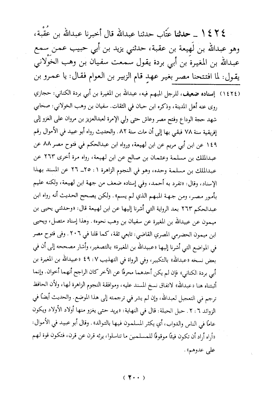 1424 - حدثنا عَتّاب حدثنا عبد الله قال أخبرنا عبد الله بن عُقْبة، وهو عبد الله بن لَهيعة بن عقبة، حدثني يزيد بن أبي حبيب عمن سمع عبد الله بن المغيرةَ بن أبي بردة يقول سمعت سفيان بن وهب الخَوْلاني يقول: لما افتتحنا مصر بغير عهدٍ قام الزبير بن العوام فقال: يا عمرو بن