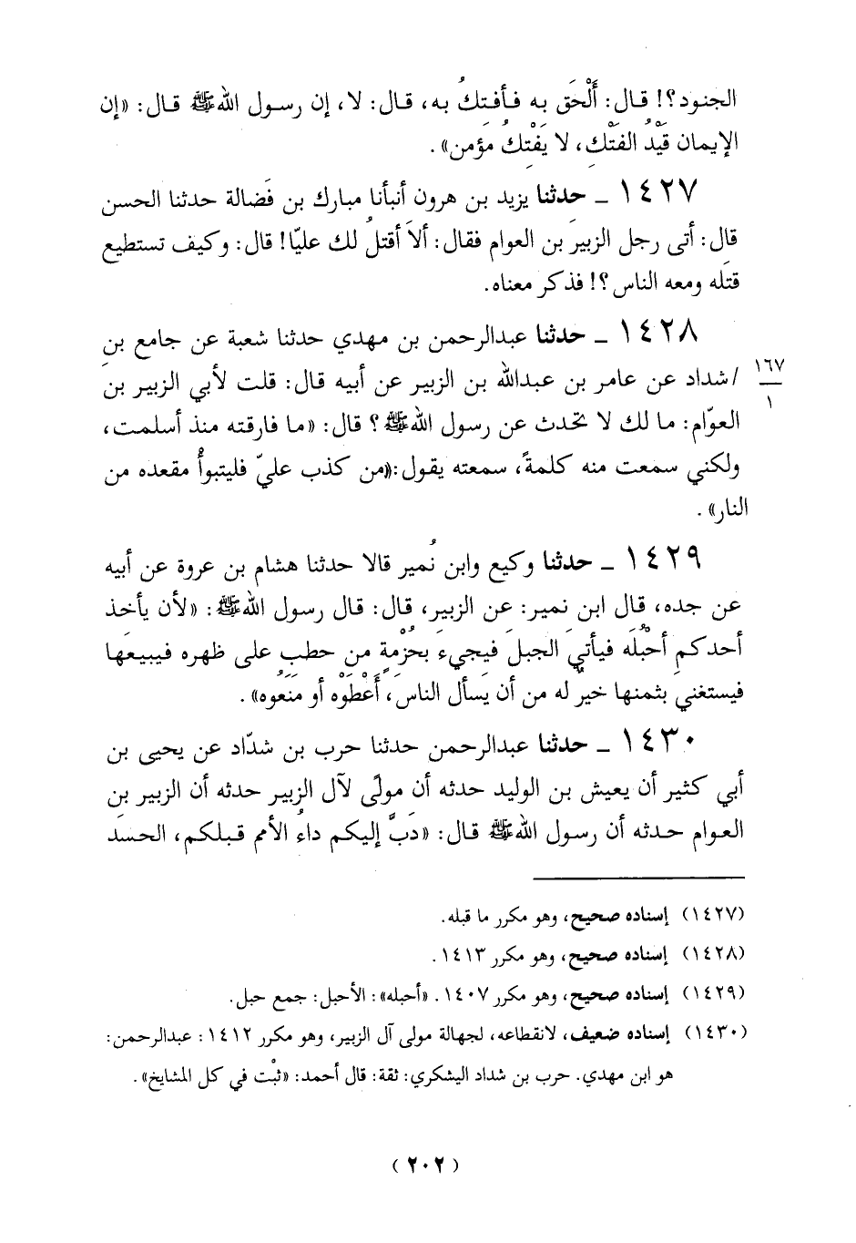 (1430) إسناده ضعيف، لانقطاعه، لجهالة مولى آل الزبير، وهو مكرر 1412: عبد الرحمن: هو ابن مهدي. حرب بن شداد اليشكري: ثقة: قال أحمد: "ثبْت في كل المشايخ".