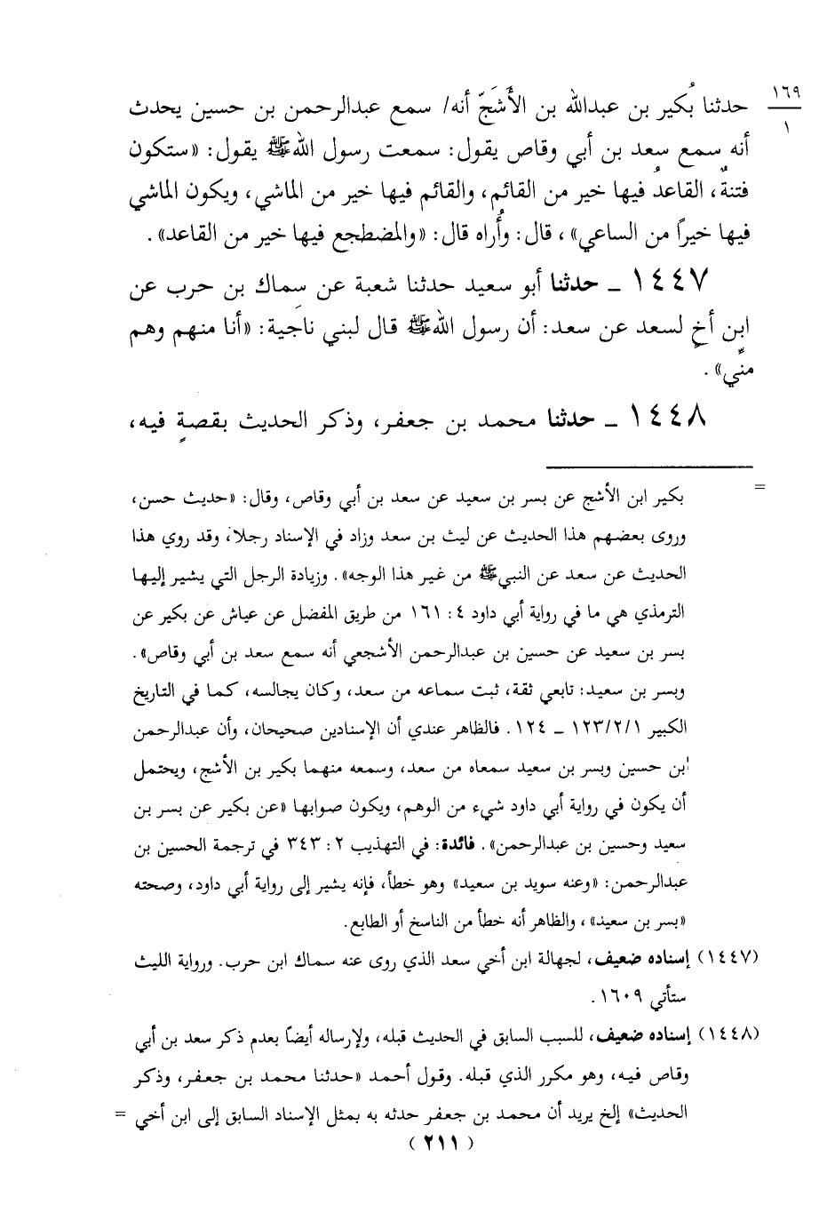 وبسر بن سعيد: تابعي ثقة، ثبت سماعه من سعد، وكان يجالسه، كما في التاريخ الكبير 1/ 2/ 123 - 124. فالظاهر عندي أن الإسنادين صحيحان، وأن عبد الرحمن ابن حسين وبسر بن سعيد سمعاه من سعد، وسمعه منهما بكير بن الأشج، ويحتمل أن يكون في رواية أبي داود شيء من الوهم، ويكون صوابها "عن بكير عن بسر بن سعيد وحسين بن عبد الرحمن". فائدة: في التهذيب 2: 343 في ترجمة الحسين بن عبد الرحمن: "وعنه سويد بن سعيد" وهو خطأ، فإنه يشير إلى رواية أبي داود، وصحته "بسر بن سعيد"، والظاهر أنه خطأ من الناسخ أو الطابع.