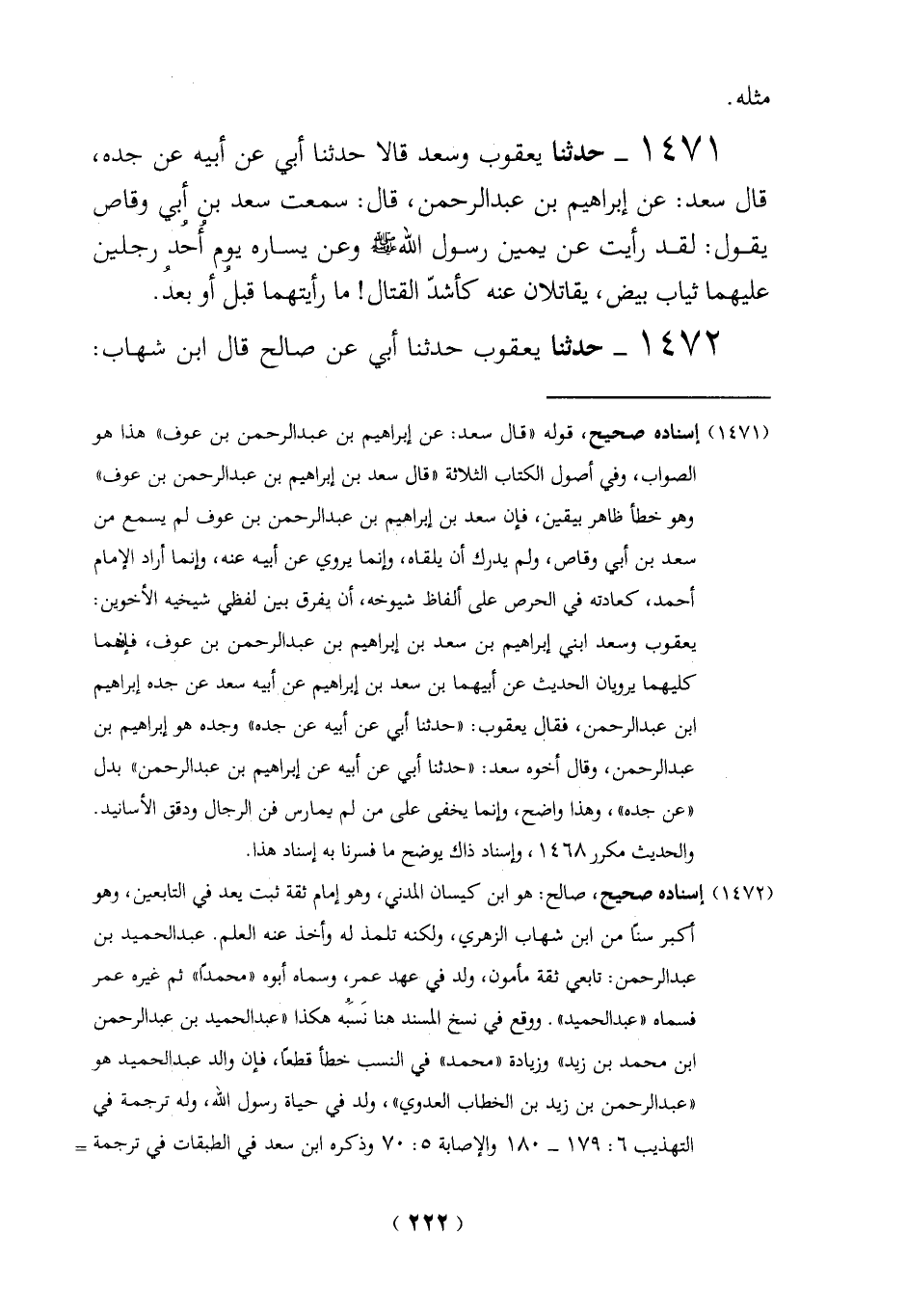 (1471) إسناده صحيح، قوله "قال سعد: عن إبراهيم بن عبد الرحمن بن عوف" هذا هو الصواب، وفي أصول الكتاب الثلائة "قال سعد بن إبراهيم بن عبد الرحمن بن عوف" وهو خطأ ظاهر بيقين، فإن سعد بن إبراهيم بن عبد الرحمن بن عوف لم يسمع من سعد بن أبي وقاص، ولم يدرك أن يلقاه، وإنما يروي عن أبيه عنه، وإنما أراد الإمام أحمد، كعادته في الحرص على ألفاظ شيوخه، أن يفرق بين لفظي شيخيه الأخوين: يعقوب وسعد ابني إبراهيم بن سعد بن إبراهيم بن عبد الرحمن بن عوف، فيما كليهما يرويان الحديث عن أبيهما بن سعد بن إبراهيم عن أبيه سعد عن جده إبراهيم ابن عبد الرحمن، فقال يعقوب: "حدثنا أبي عن أبيه عن جده " وجده هو إبراهيم بن عبد الرحمن، وقال أخوه سعد: "حدثنا أبي عن أبيه عن إبراهيم بن عبد الرحمن" بدل "عن جده"، وهذا واضح، وإنما يخفى على من لم يمارس فن الرجال ودقق الأسانيد.