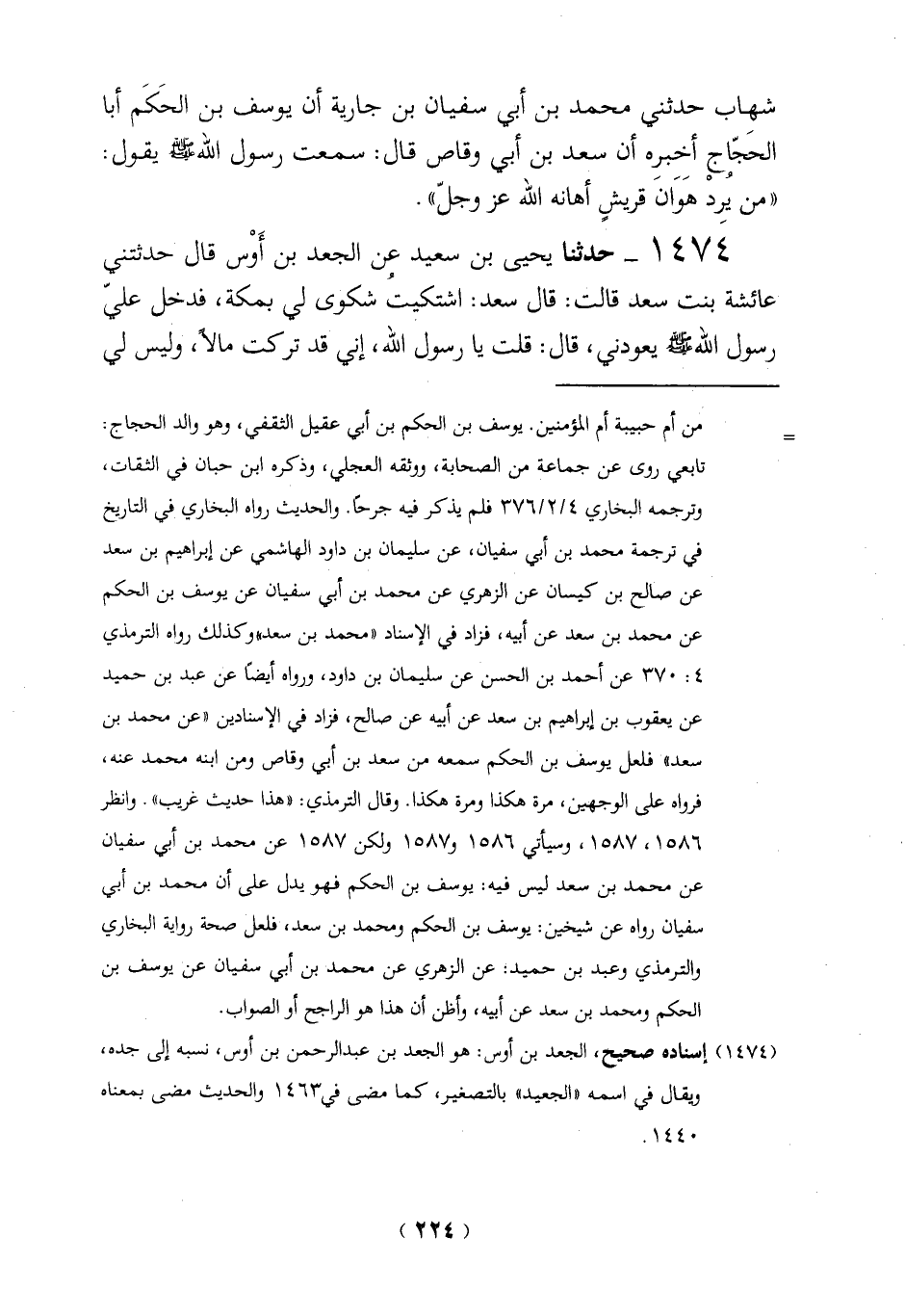 1474 - حدثنا يحيى بن سعيد عن الجعد بن أَوْس قال حدثتني عائشة بنت سعد قالت: قال سعد: اشتكيتُ شكوى لى بمكة، فدخل عليّ رسول الله - صلى الله عليه وسلم - يعودني، قال: قلت يا رسول الله، إني قد تركت مالاً، وليس لى