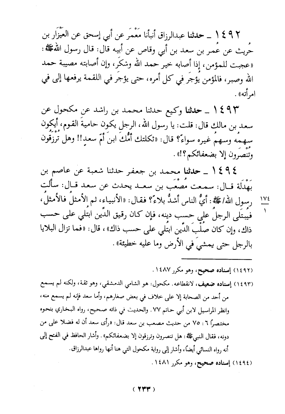(1493) إسناده ضعيف، لانقطاعه. مكحول: هو الشامي الدمشقي، وهو ثقة، ولكنه لم يسمع من أحد من الصحابة إلا على خلاف في بعض صغارهم، وأما سعد فإنه لم يسمع منه، وانظر المراسيل لابن أبي حاتم 77. والحديت ى ذاته صحيح، رواه البخاري بنحوه مختصراً 6: 75 من حديث مصعب بن سعد قال: "رأى سعد أن له فضلا على من دونه، فقال النبي - صلى الله عليه وسلم -: هل تنصرون وترزقرن إلا بضعفائكم". وأشار الحافظ في الفتح إلى أنه رواه النسائي أيضاً، وأشار إلى رواية مكحول التى هنا أنها رواها عبد الرزاق.