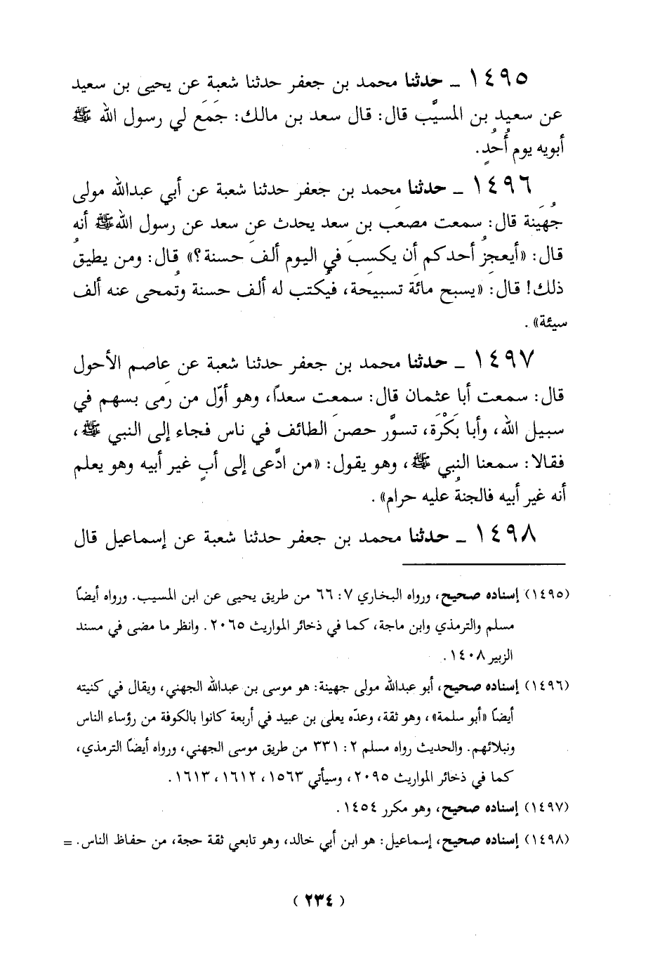 1496 - حدثنا محمد بن جعفر حدثنا شعبة عن أبي عبد الله مولى جُهَينة قال: سمعت مصعَب بن سعد يحدث عن سعد عن رسول الله - صلى الله عليه وسلم - أنه قال: "أيعجزُ أحدكم أن يكسِبَ في اليوم ألفَ حسنة؟ " قال: ومن يطيقُ ذلك! قال: "يسبح مائَة تسبيحة، فيُكتب له ألف حسنة وتُمحى عنه ألف سيئة".