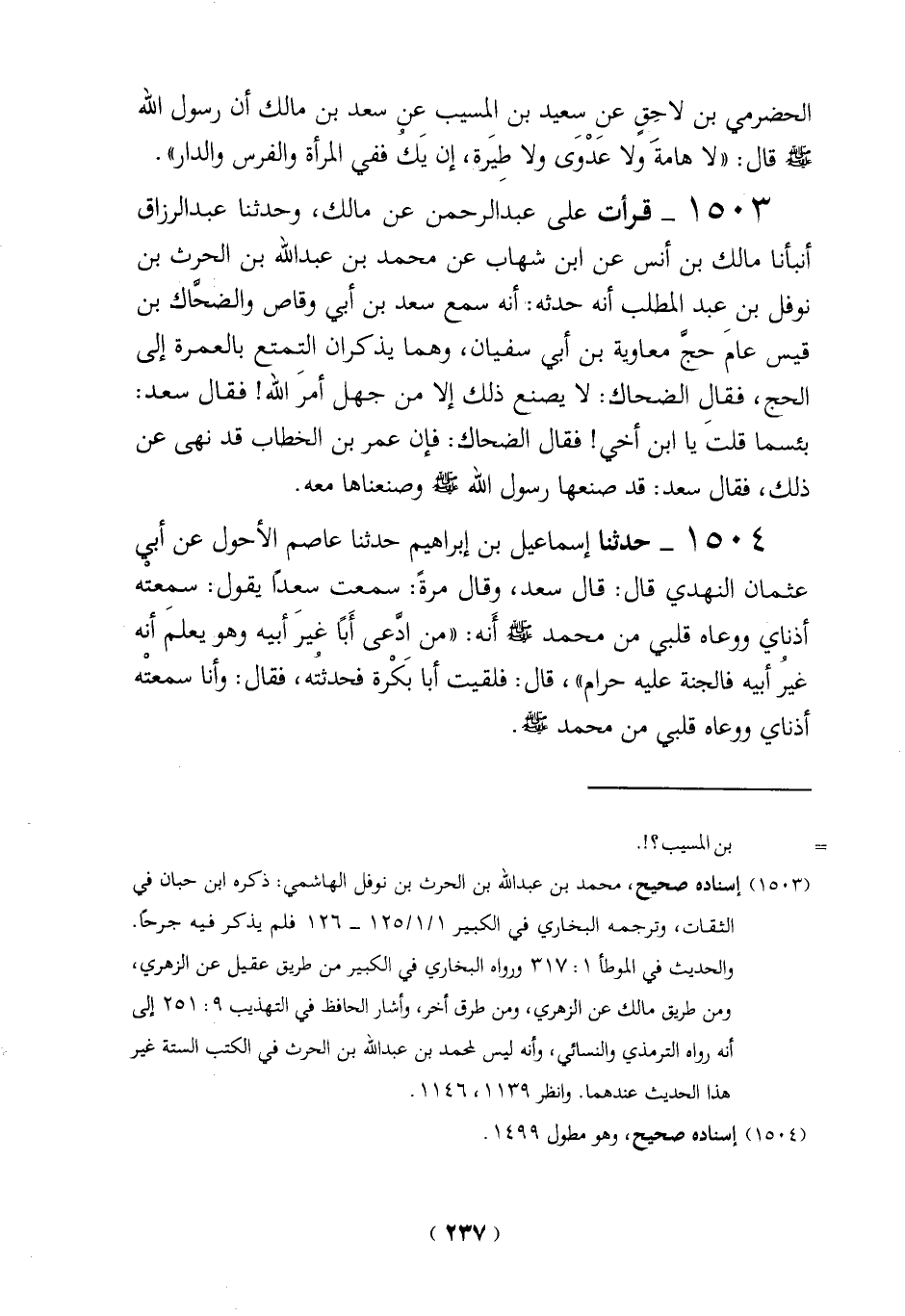 1504 - حدثنا إسماعيل بن إبراهيم حدثنا عاصم الأحول عن أبي عثمان النهدي قال: قال سعد، وقال مرةً: سمعت سعدًا يقول: سمعتْه أذناي ووعاه قلبي من محمد - صلى الله عليه وسلم - أَنه: "من ادعى أَباً غيرَ أبيه وهو يعلمَ أنه غيرُ أبيه فالجنة عليه حرام"، قال: فلقيت أبا بَكْرة فحدثُته، فقال: وأنا سمعتْه أذناي ووعاه قلبي من محمد - صلى الله عليه وسلم -.