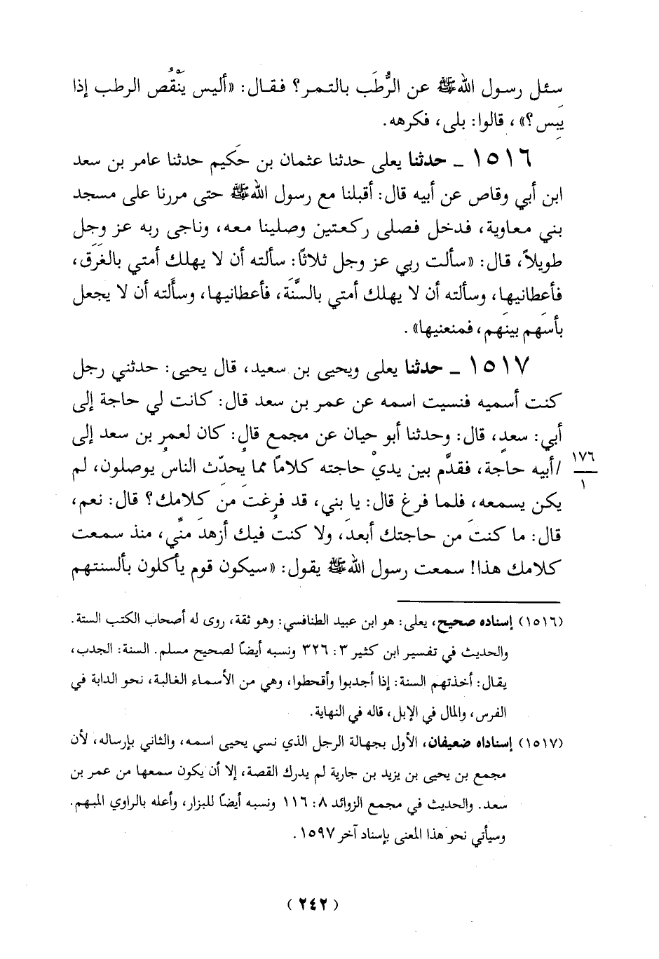(1517) إسناداه ضعيفان، الأول بجهالة الرجل الذي نسي يحيى اسمه، والثاني بإرساله، لأن مجمع بن يحيى بن يزيد بن جارية لم يدرك القصة، إلا أن يكون سمعها من عمر بن سعد. والحديث في مجمع الزوائد 8: 116 ونسبه أيضاً للبزار، وأعله بالراوي المبهم.