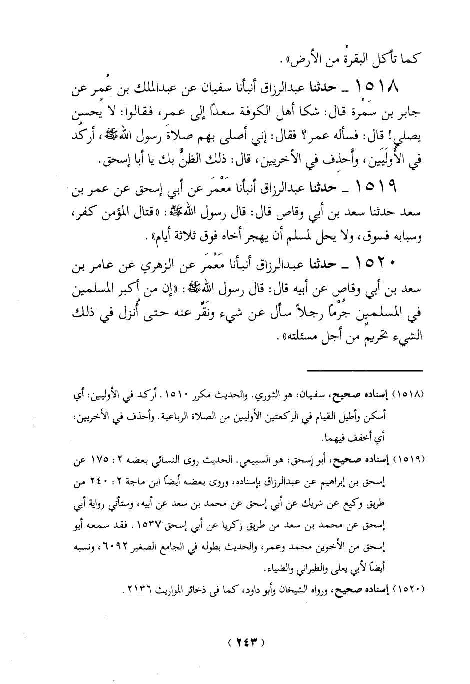 َ1519 - حدثنا عبد الرزاق أنبأنا مَعْمَر عن أبي إسحق عن عمر بن سعد حدثنا سعد بن أبي وقاص قال: قال رسول الله - صلى الله عليه وسلم -: "قتال المؤمن كفر، وسبابه فسوق، ولا يحل لمسلم أن يهجر أخاه فوق ثلاثة أيام".