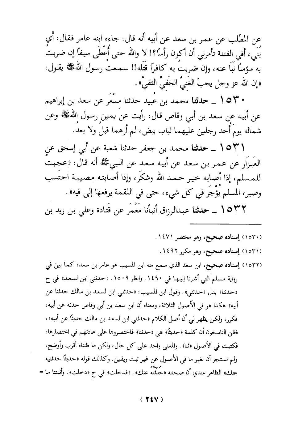 (1532) إسناده صحيح، ابن سعد الذي سمع منه ابن المسيب هو عامر بن سعد، كما بين في رواية مسلم التي أشرنا إليها في 1490. وانظر 1509. "حدثني ابن لسعد" في ح "حدثنا" بدل "حدثني". وقول ابن المسيب: "حدثني ابن لسعد بن مالك حدثنا عن أبيه" هكذا هو في الأصول الثلاثة، ومعناه أن ابن سعد بن أبي وقاص حدثه عن أبيه، فكرر، ولكن يظهر لي أن أصل الكلام "حدثني ابن لسعد بن مالك حديثاً عن أبيه"، فظن الناسخون أن كلمة "حديثاً" هى "حدثنا" فاختصروها على عادتهم في اختصارها، فكتبت في الأصول "ثنا". والمعنى واحد على كل حال، ولكن ما ظنناه أقرب وأوضح، ولم نستجز أن نغير ما في الأصول عن غير ثبت ويقين. وكذلك قوله "حديثاً حدثنيه عنك" الظاهر عندي أن صحته "حُدَّ ثْتُهُ عنك". "فدخلت" في ح "دخلت". وأثبتنا ما =