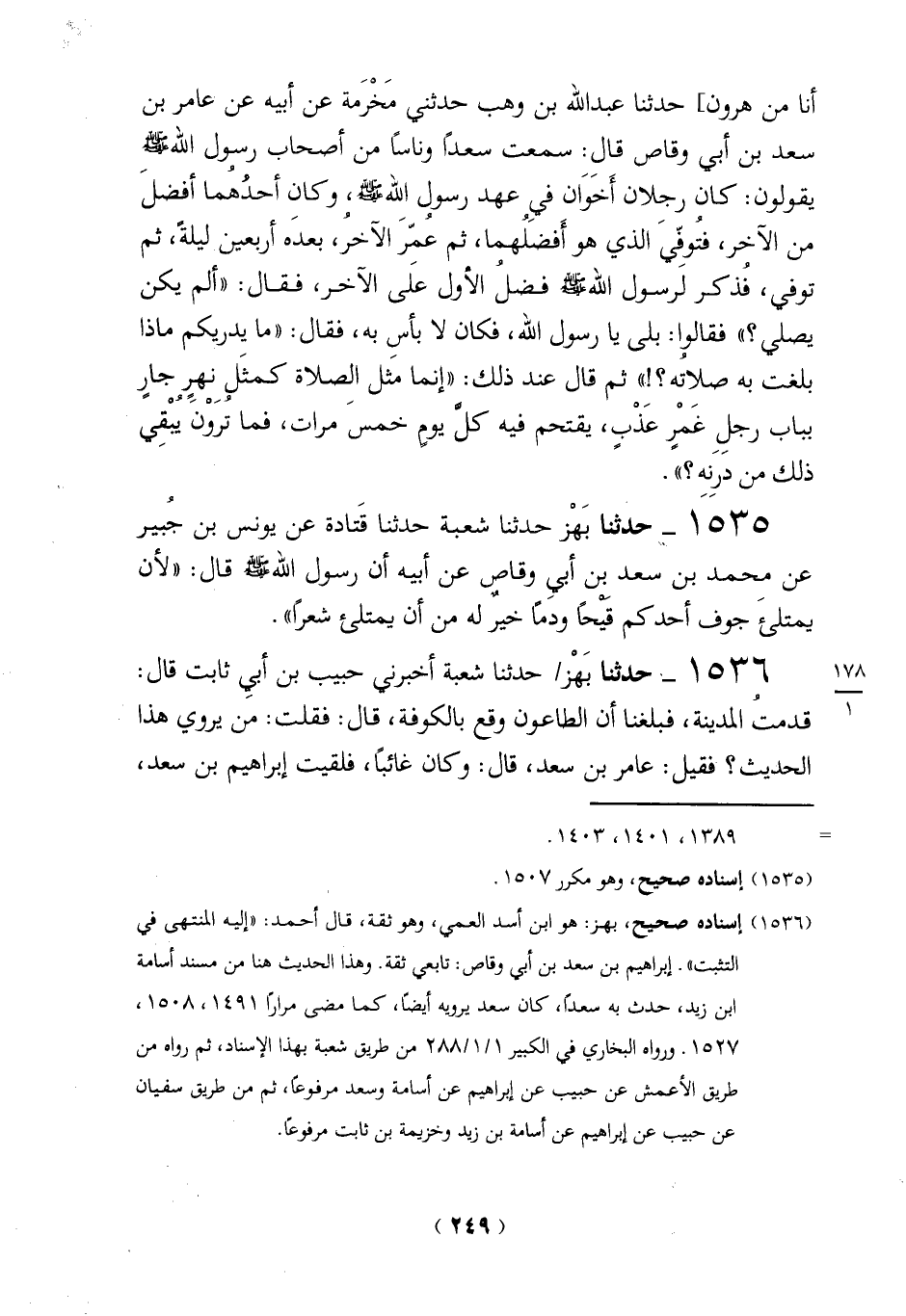 (1536) إسناده صحيح، بهز: هو ابن أسد العمي، وهو ثقة، قال أحمد: "إليه المنتهى في التثبت". إبراهيم بن سعد بن أبي وقاص: تابعي ثقة. وهذا الحديث هنا من مسند أسامة ابن زيد، حدث به سعداً، كان سعد يرويه أيضاً، كما مضى مرارا 1491، 1508، 1527. ورواه البخاري في الكبير 1/ 1/ 288 من طريق شعبة بهذا الإسناد، ثم رواه من طريق الأعمش عن حبيب عن إبراهيم عن أسامة وسعد مرفوعاً، ثم من طريق سفيان عن حبيب عن إبراهيم عن أسامة بن زيد وخزيمة بن ثابت مرفوعَاً.