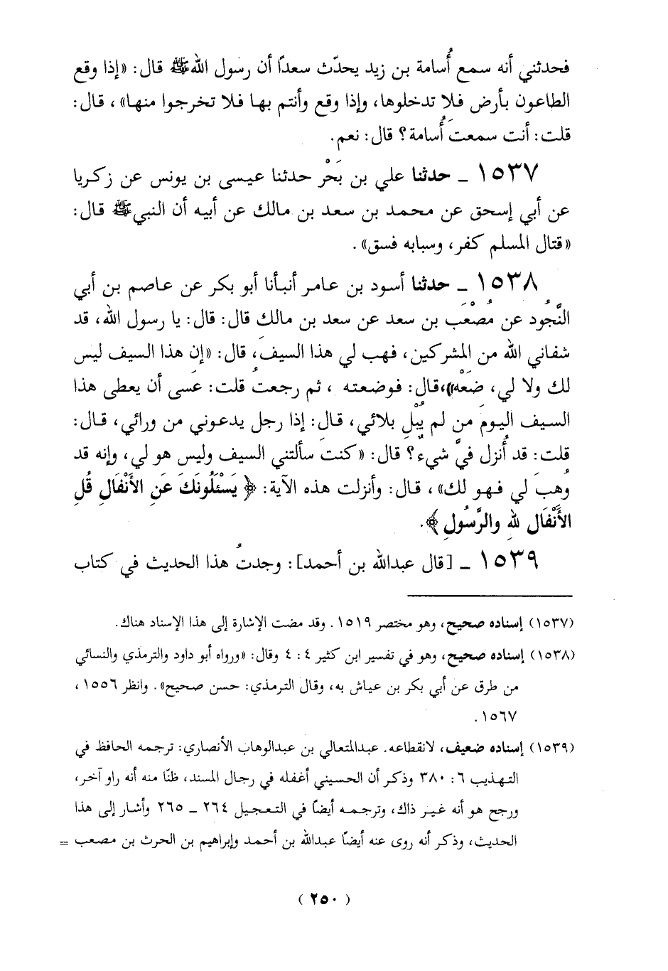 1538 - حدثنا أسود بن عامر أنبأنا أبو بكر عن عاصم بن أبي النَّجُود عن مُصْعَب بن سعد عن سعد بن مالك قال: قال: يا رسول الله، قد شفاني الله من المشركين، فهب لى هذا السيفَ، قال: "إن هذا السيف ليس لك ولا لي، ضَعْه"، قال: فوضعته، ثم رجعتُ قلت: عَسى أن يعطى هذا السيف اليومَ من لم يُبْلِ بلائي، قال: إذا رجل يدعوني من ورائي، قال: قلت: قد أُنزل فيَّ شىءٌ؟ قال: "كنتَ سألتني السيف وليس هو لي، وإنه قد وُهبَ لى فهو لك"، قال: وأنزلت هذه الآية: {يَسْأَلُونَكَ عَنِ الْأَنْفَالِ قُلِ الْأَنْفَالُ لِلَّهِ وَالرَّسُولِ}.