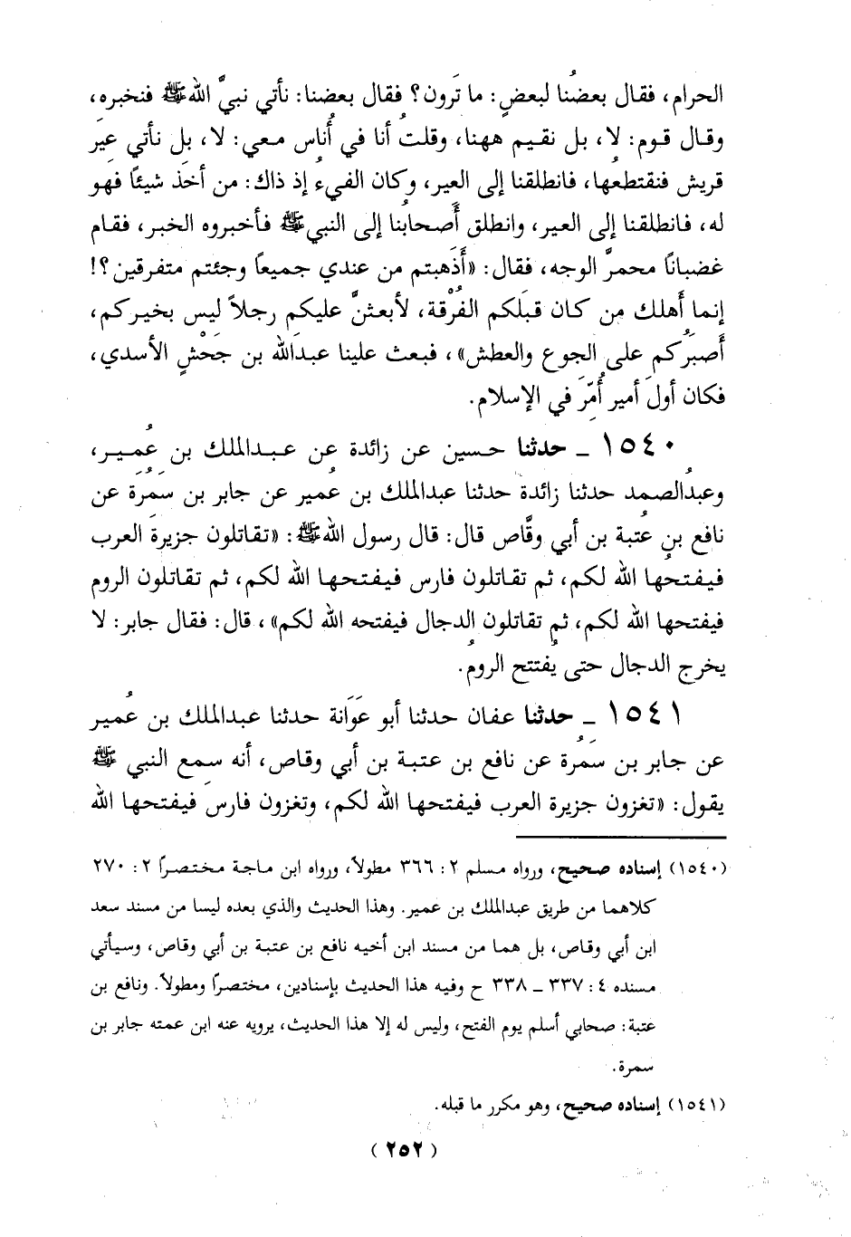 1541 - حدثنا عفان حدثنا أبو عَوَانة حدثنا عبد الملك بن عُمير عن جابر بن سَمُرة عن نافع بن عتبة بن أبي وقاص، أنه سِمع النبي - صلى الله عليه وسلم - يقول: "تغزون جزيرة العرب فيفتحها الله لكم، وتغزون فارس فيفتحها الله