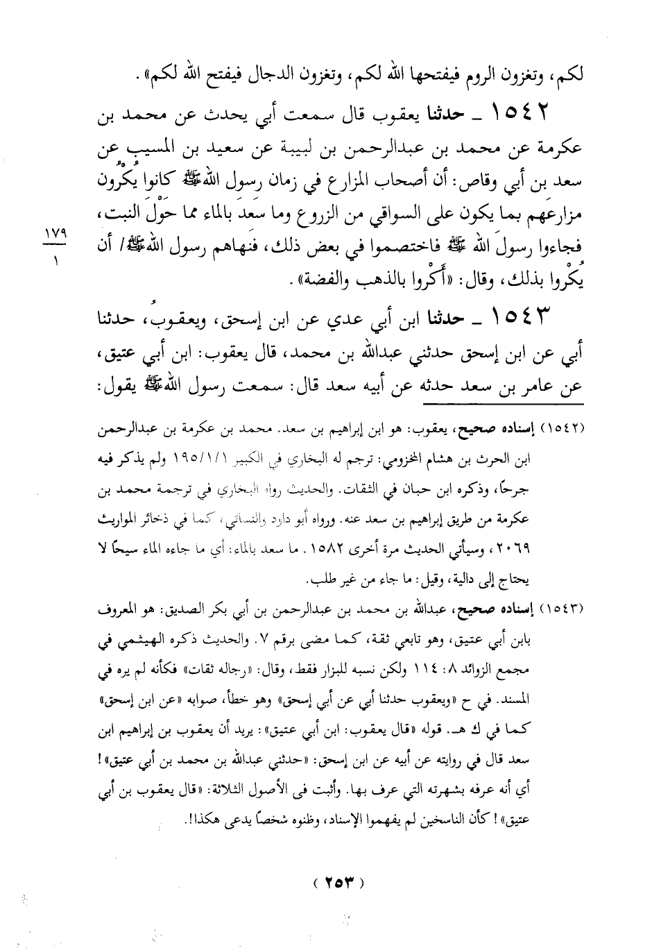 (1542) إسناده صحيح، يعقوب: هو ابن إبراهيم بن سعد. محمد بن عكرمة بن عبد الرحمن ابن الحرث بن هشام المخزومي: ترجم له البخاري في الكبير 1/ 1 /195ولم يذكر فيه جرحَاً، وذكره ابن حبان في الثقات. والحديث رواه البخاري في ترجمة محمد بن عكرمة من طريق إبراهيم بن سعد عنه. ورواه أبو داود والنسائي، كما في ذخائر المواريث 2069، وسيأتي الحديث مرة أخرى 1582. ما سعد بالماء: أي ما جاءه الماء سيحاً لا يحتاج إلى دالية، وقيل: ما جاء من غير طلب.