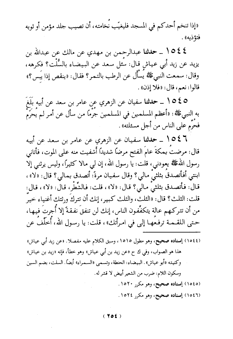 1546 - حدثنا سفيان عن الزهري عن عامر بن سعد عن أبيه قال: مرضتُ بمكةَ عامَ الفتح مرضاً شديداً أَشفيت منه على الموت، فأتاني رسول الله - صلى الله عليه وسلم - يعودني، قلت: يا رسول الله، إن لى مالا كثيراً، وليس يرثني إلا ابنتي أفأتصدقُ بثلثيْ مالى؟ وقال سفيان مرةً: أتصدق بمالي؟ قال: "لا"، قال: فأتصدقُ بثلثيْ مالى؟ قال: "لا"، قلت: فالشَّطْر، قال: "لا"، قال: قلت: الثلث؟ قال: "الثلث، والثلث كبير، إنك أن تتركَ ورثتك أغنيِاء خيرٌ من أن تتركهم عالة يتكفَّفون الناس، إنك لن تنفقَ نفقةً إلا أُجرت فيها، حتى اللقمة ترفعُها إلى في امرأتك"، قلت: يارسول الله، أُخلَّفُ عن