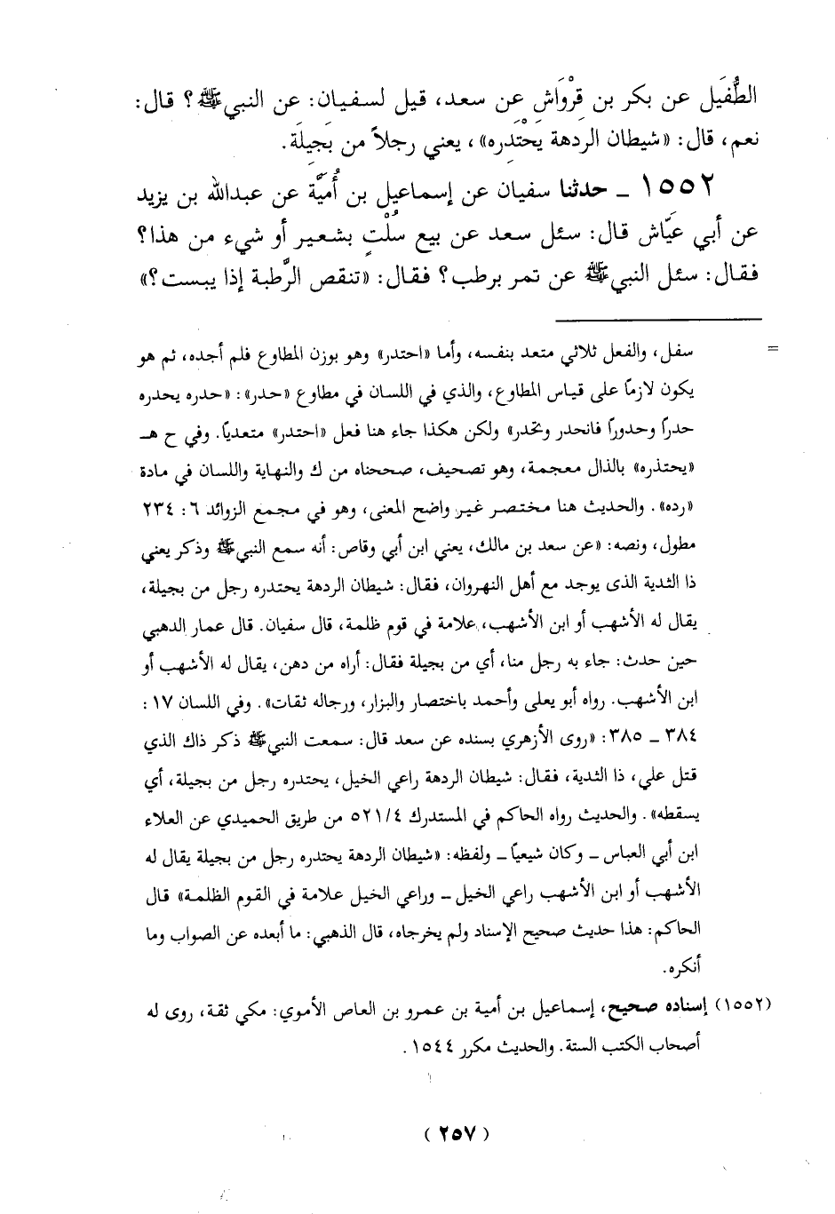 الطُفَيل عن بكر بن قرْوَاشِ عن سعد، قيل لسفيان: عن النبي - صلى الله عليه وسلم -؟ قال: نعم، قال: "شيطان الرَدهة يَحْتَدِره"، يعني رجلاً من بَجيِلَة.