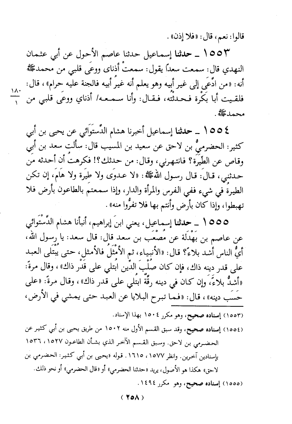 (1554) إسناده صحيح، وقد سبق القسم الأول منه 1502 من طريق يحيى بن أبي كثير عن الحضرمي بن لاحق. وسبق القسم الآخر الذي بشأن الطاعون 1527، 1536 بإسنادين آخرين. وانظر 1577، 1615. قوله "يحيى بن أبي كثير: الحضرمي بن لاحق" هكذا هو الأصول، يريد "حدثنا الحضرمي" أو "قال الحضرمي" أو نحو ذلك.