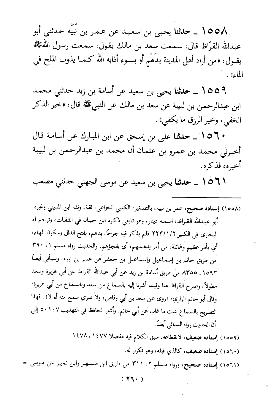 1558 - حدثنا يحيى بن سعيد عن عمر بن نُبَيْه حدثني أبو عبد الله القرّاظ قال: سمعت سعد بن مالك يقول: سمعت رسول الله - صلى الله عليه وسلم - يقول: "من أراد أهل المدينة بدَهْمٍ أو بسوء أذابه الله كما يذوب الملح في الماء".