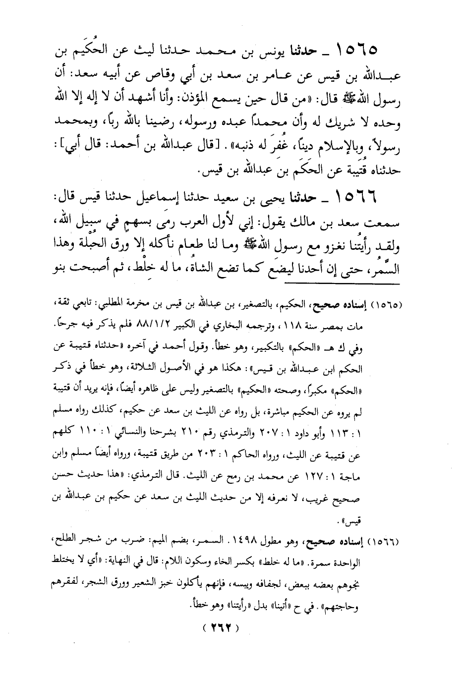 1565 - حدثنا يونس بن محمد حدثنا ليث عن الحُكَيم بن عبد الله بن قيس عن عامر بن سعد بن أبي وقاص عن أبيه سعد: أن رسول الله - صلى الله عليه وسلم - قال: "من قال حين يسمع المؤذن: وأنا أشهد أن لا إله إلا الله وحده لا شريك له وأن محمدًا عبده ورسوله، رضينا بالله رباً، وبمحمد رسولا، وِبالإسلام دينًا، غُفِرَ له ذنبه". [قال عبد الله بن أحمد: قال أبي]: حدثناه قُتَيبة عن الحَكَم بن عبد الله بن قيس.