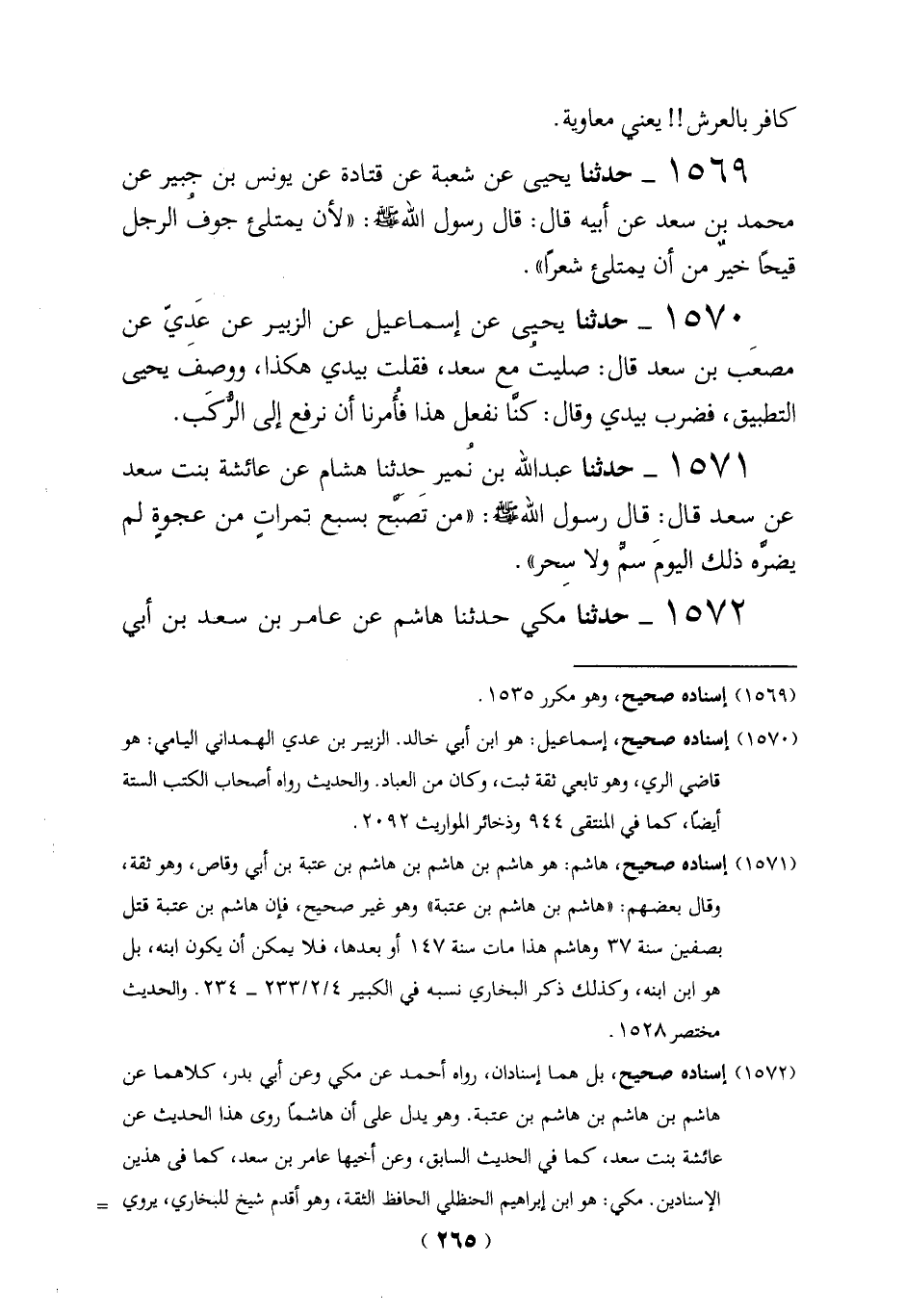 (1572) إسناده صحيح، بل هما إسنادان، رواه أحمد عن مكي وعن أبي بدر، كلاهما عن هاشم بن هاشم بن هاشم بن عتبة. وهو يدل على أن هاشماً روى هذا الحديث عن عائشة بنت سعد، كما في الحديث السابق، وعن أخيها عامر بن سعد، كما في هذين الإسنادين. مكي: هو ابن إبراهيم الحنظلي الحافظ الثقة، وهو أقدم شيخ للبخاري، يروي =
