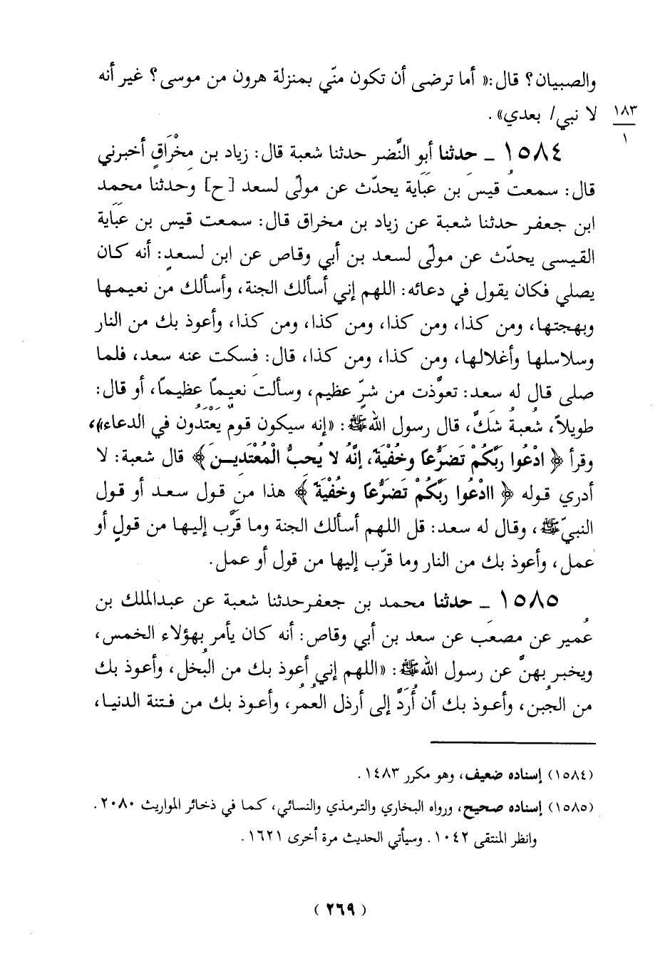 1584 - حدثنا أبو النَّضر حدثنا شعبة قال: زيافى بن مِخْرَاقٍ أخبرني قال: سمعتُ قيسَ بن عَبَاية يحدّث عن مولى لسعد [ح]، وحدثنا محمد ابن جعفر حدثنا شعبة عن زياد بن مخراق قال: سمعت قيس بن عَبَاية القيسي يحدّث عن مولى لسعد بن أبي وقاص عن ابن لسعدِ: أنه كان يصلي فكان يقول في دعائه: اللهم إني أسألك الجنة، وأسألك من نعيمها وبهجتها، ومن كذا، ومن كذا، ومن كذا، ومن كذا، وأعوذ بك من النار وسلاسلها وأغلالها، ومن كذا، ومن كذا، قال: فسكت عنه سعد، فلما