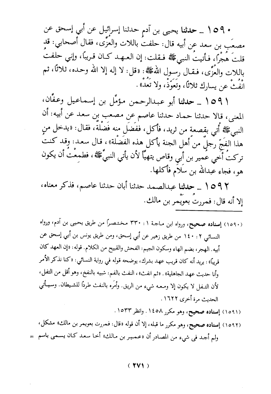 1590 - حدثنا يحيى بن آدم حدثنا إسرإئيل عن أبي إسحق عن مصعَب بن سعد عن أبيه قال: حلفت باللات والعُزَّى، فقال أصحابى: قد قلتَ هُجْراً، فأتيتُ النبي - صلى الله عليه وسلم - فقلت: إن العهد كان قريباً، وإنى حلفتُ باللات والعُزَّى، فقال رسِول الله - صلى الله عليه وسلم -: "قل: لا إله إلا الله وحده، ثلاثاً، ثم انْفُثْ عن يسارك ثلاثاً، وتَعَوّذْ، ولا تَعُدْ".
