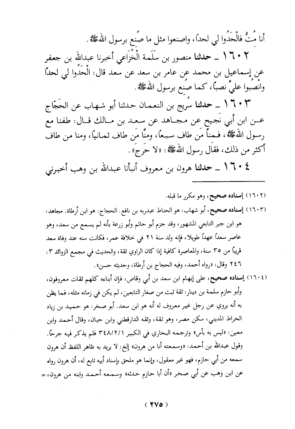 (1604) إسناده صحيح، على إبهام ابن سعد بن أبي وقاص، فإن أبناءه كلهم ثقات معروفون، وأبو حازم سلمة بن دينار: ثقة ثبت من صغار التابعين، لم يكن في زمانه مثله، فما يظن به أنه يروي عن رجل غير معروف له أنه هو ابن سعد. أبو صخر: هو حميد بن زياد الخراط المديني، سكن مصر، وهو ثقة، وثقه الدارقطي وابن حبان، وقال أحمد وابن معين: "ليس به بأس" وترجمه البخاري في الكبير 1/ 2/ 348 فلم يذكر فيه جرحا ً.